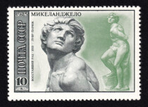 3) Скульптура "Рабочий и колхозница". 3 к. Кат. № 4546. Цвет: лилово-красная. Печать: металлография. Перфорация гребенчатая 12 : 12 1/2.
