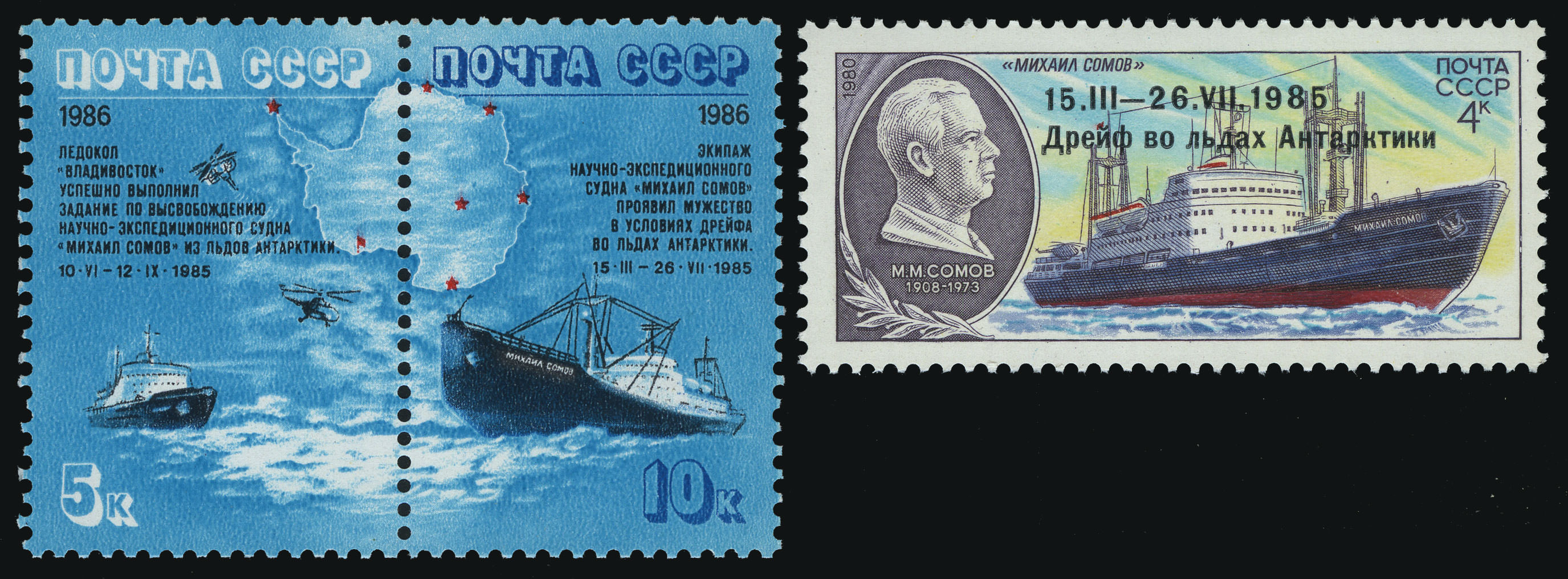 - 5697. Надпечатка типографская черная текста "15. III – 26. VII. 1985. Дрейф во льдах Антарктики" на марке 5064.
