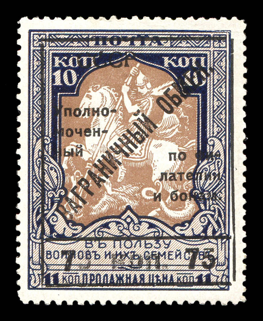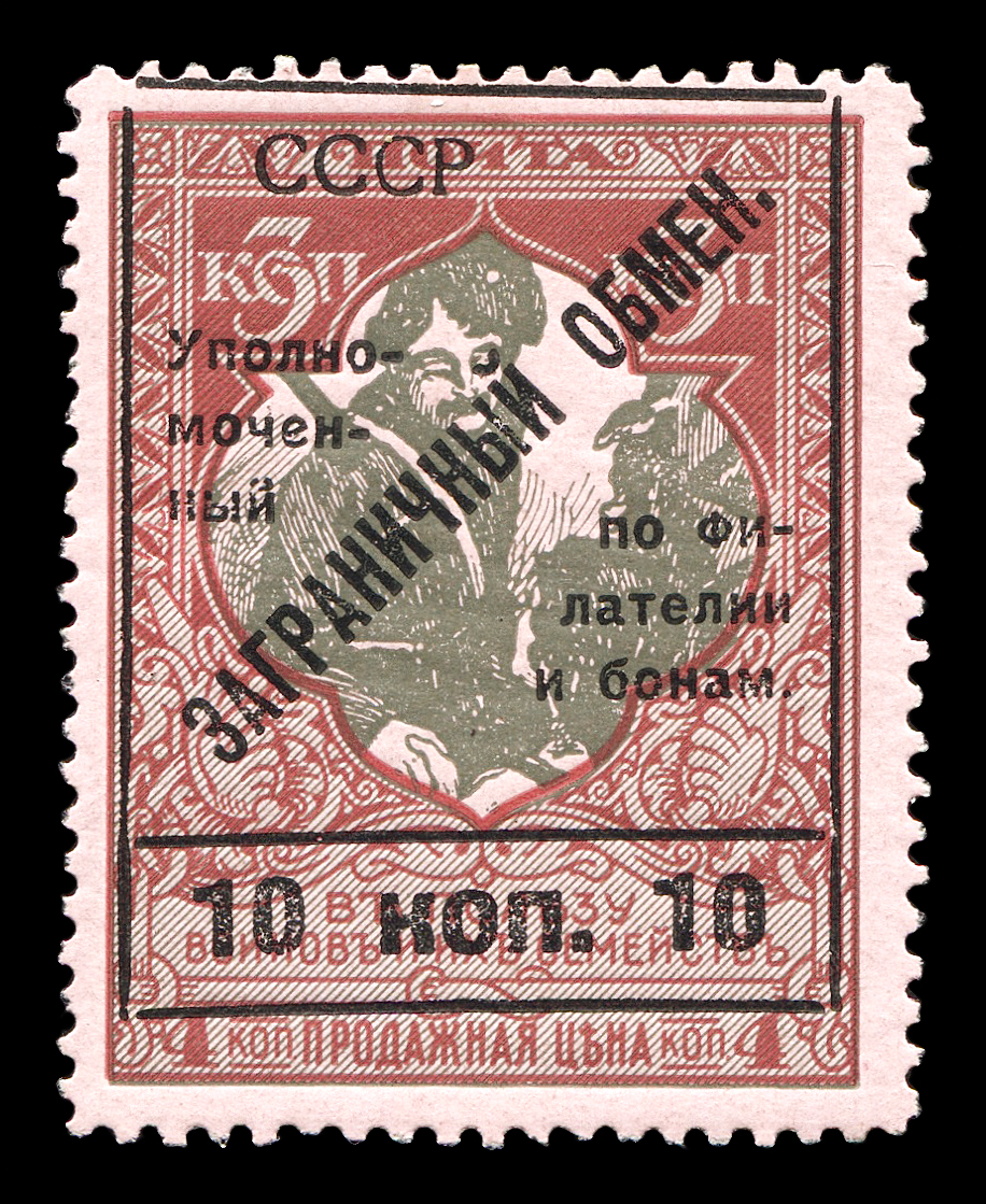 Кат. № PE7. Надпечатка типографская черная текста "С.С.С.Р. Уполномоченный по филателии и бонам. заграничный обмен. 10 коп. 10" на почтово-благотворительной марке Российской Империи. 10 к./3 к. Перфорация линейная 11 1/2.