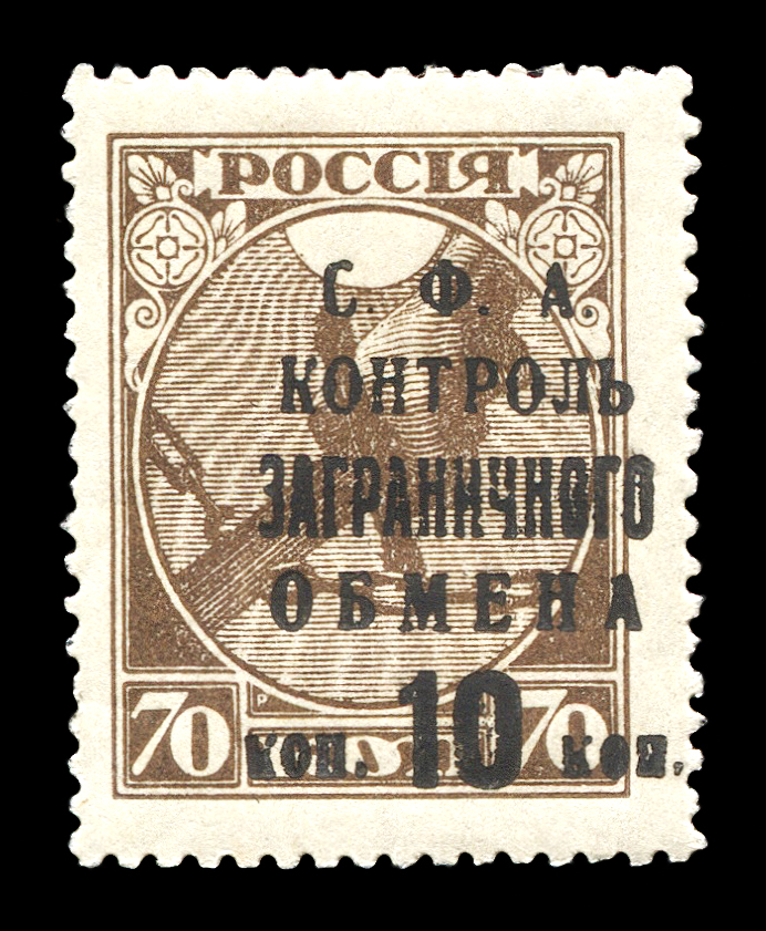 Кат. № PE26. Надпечатка типографская черная "С.Ф.А. контроль ЗАГРАНИЧНОГО обмена коп.5 коп." на марке РСФСР 1.