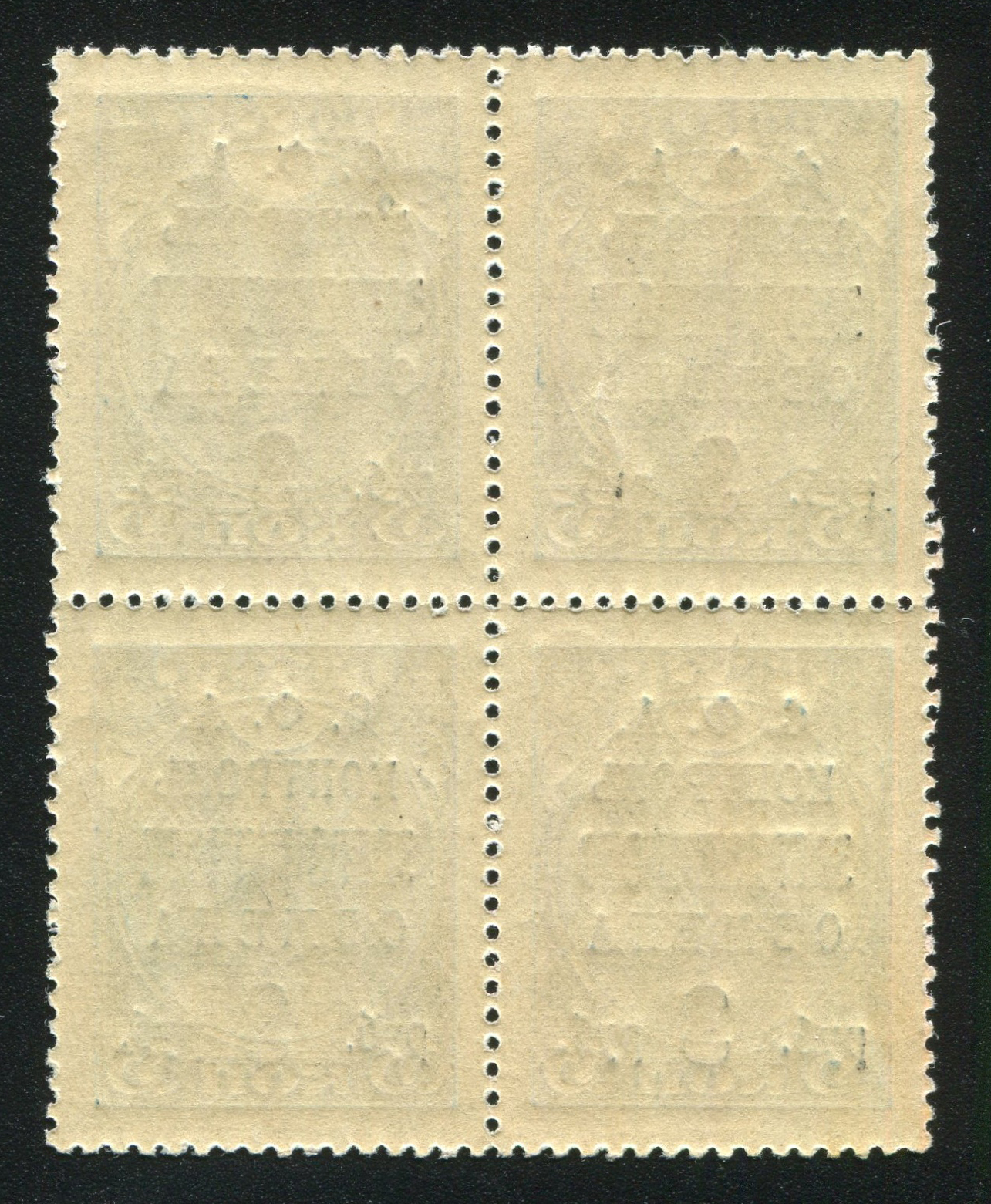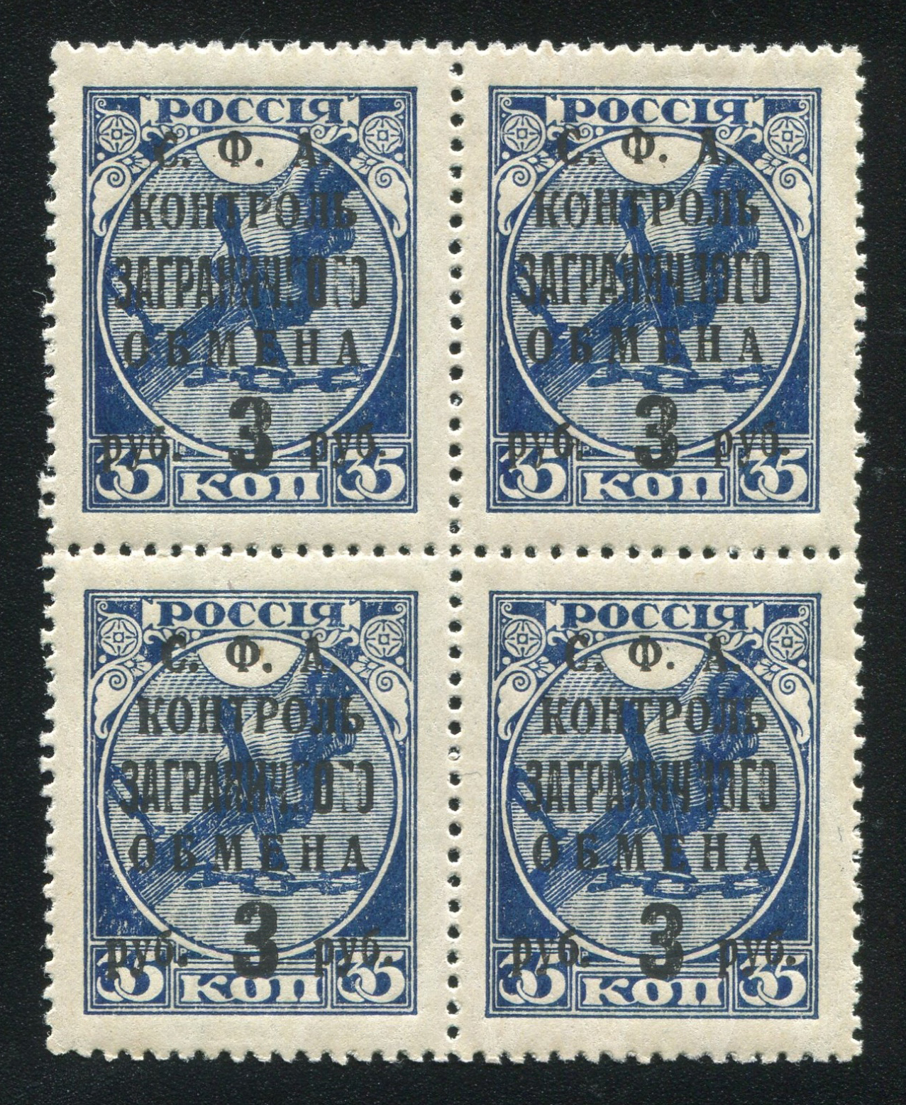 Квартблок. Кат. № PE26. Надпечатка типографская черная "С.Ф.А. контроль ЗАГРАНИЧНОГО обмена коп.5 коп." на марке РСФСР 1.
