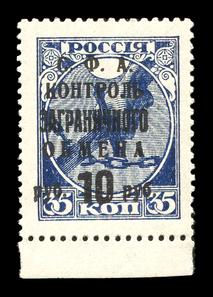 Кат. № PE18. Без просечки с одной стороны. Надпечатка типографская черная "Контроль СФА ЗАГРАНИЧНОГО обмена" и нового номинала.