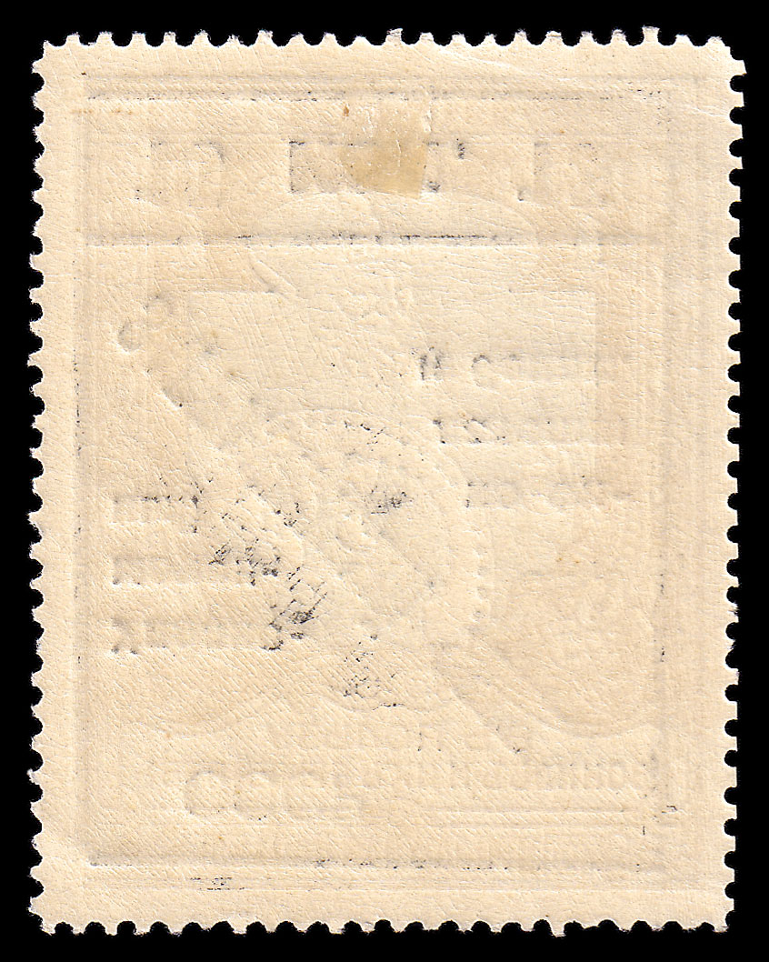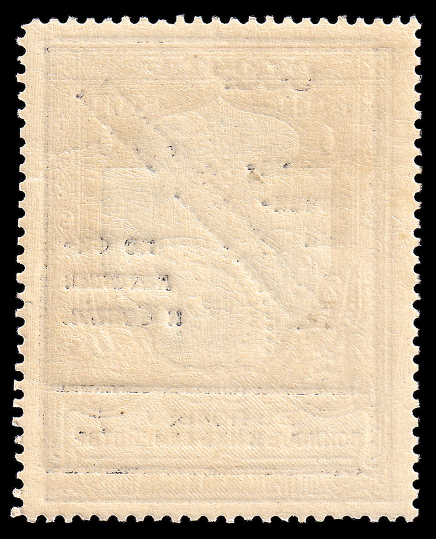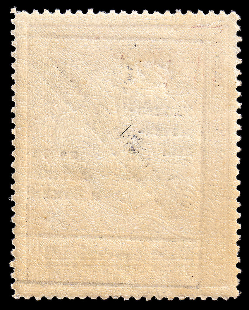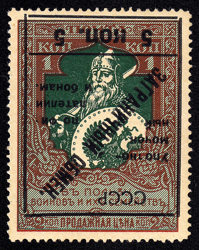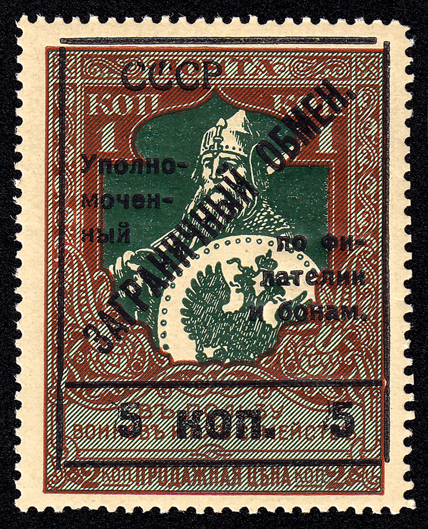 Кат. № PE6Ta. Надпечатка перевернута. Клей восстановлен. Надпечатка типографская черная текста "С.С.С.Р. Уполномоченный по филателии и бонам. заграничный обмен. 5 коп. 5" на почтово-благотворительной марке Российской Империи.
