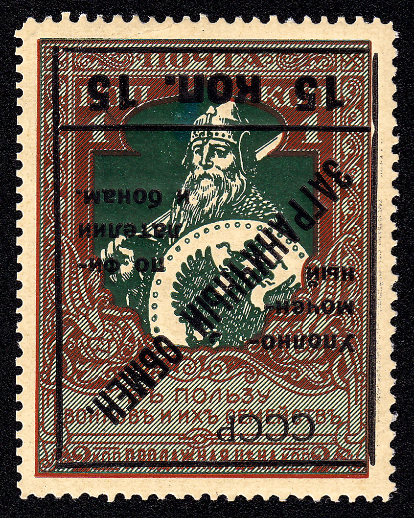 Кат. № PE8Ta. С наклейкой. Надпечатка перевернута. Надпечатка типографская черная текста "С. С. С. Р. Уполномоченный по филателии и бонам. заграничный обмен. 15 коп. 15" на почтово-благотворительной марке Российской Империи.