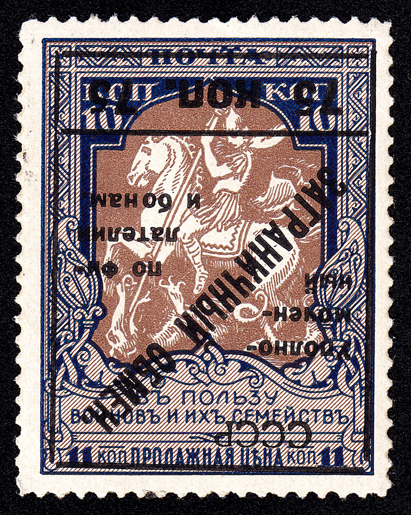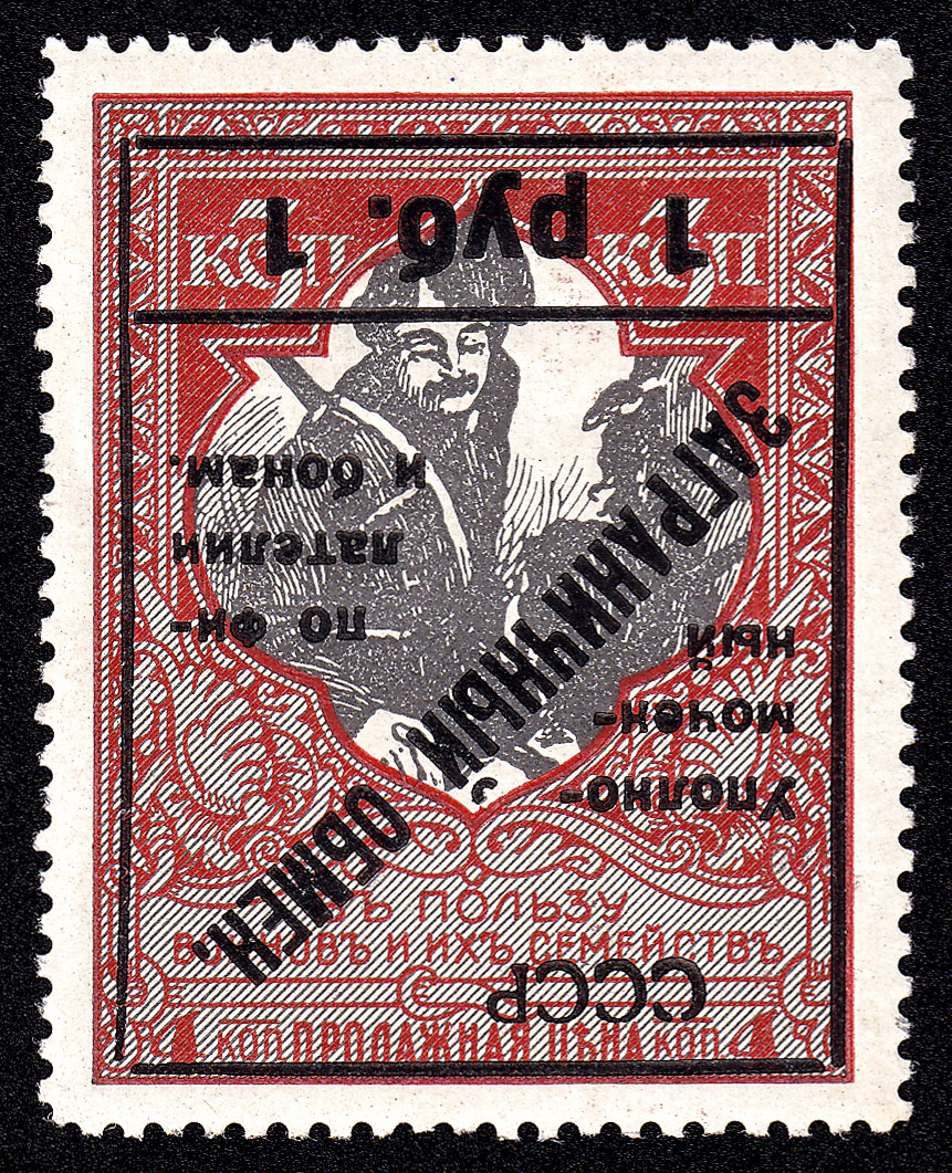 Кат. № PE12A Ta. С наклейкой. Надпечатка перевернута. Надпечатка типографская черная текста "С. С. С. Р. Уполномоченный по филателии и бонам. заграничный обмен. 1 руб. 1" на почтово-благотворительной марке Российской Империи.