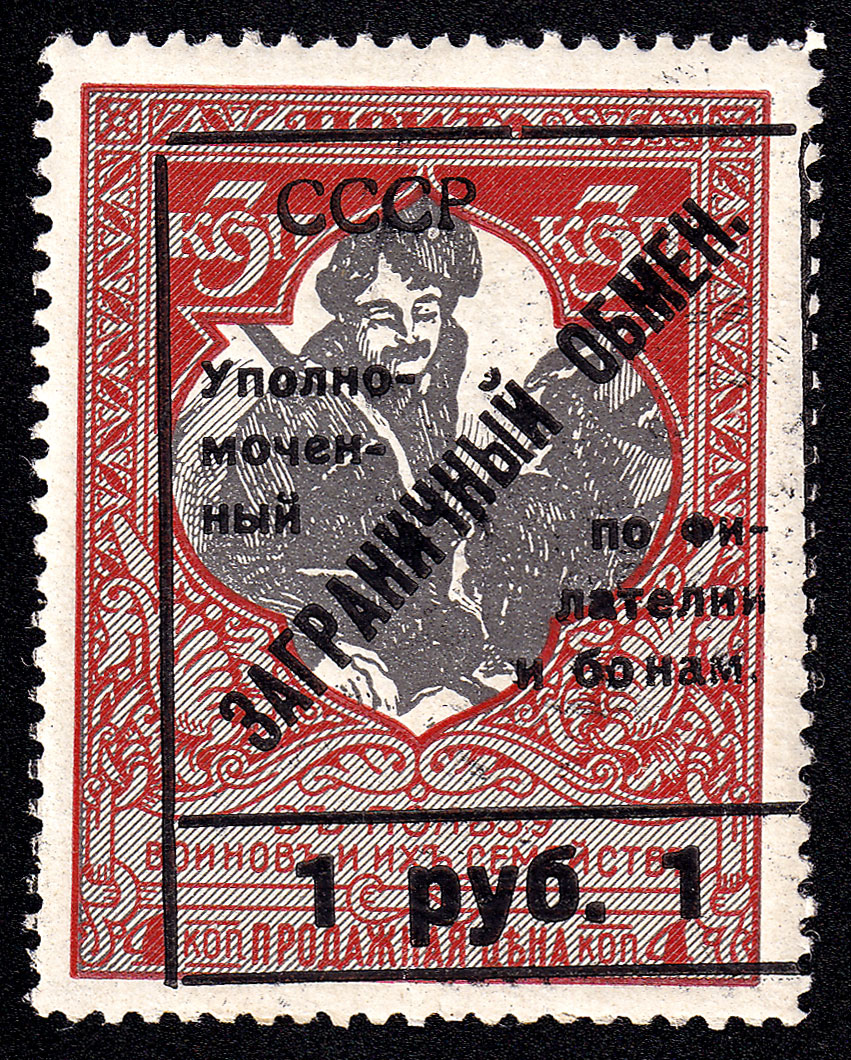 Кат. № PE12A. Надпечатка типографская черная текста "С.С.С.Р. Уполномоченный по филателии и бонам. заграничный обмен. 1 руб. 1" на почтово-благотворительной марке Российской Империи.