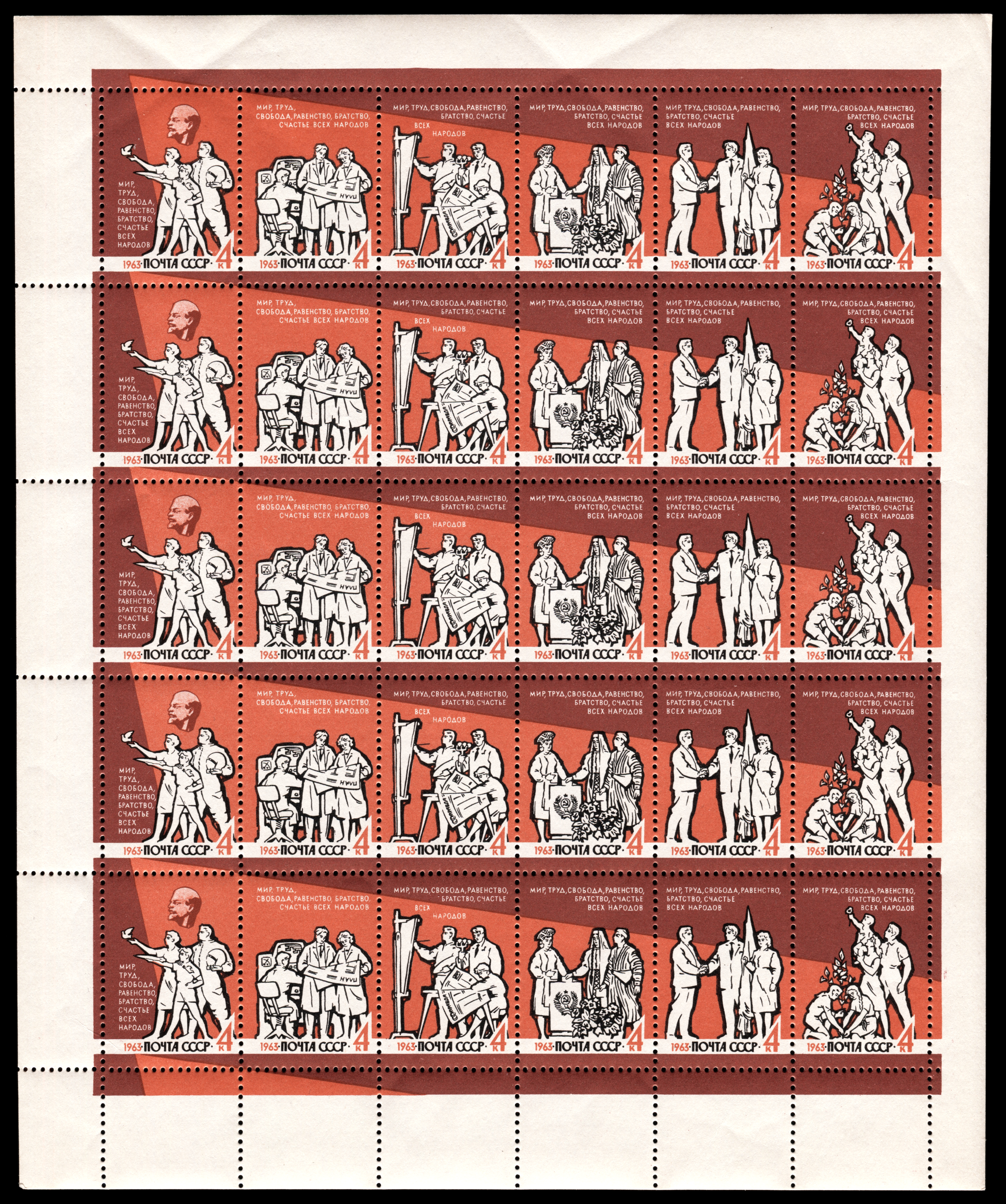 Лист 36 марок (6 х6). Кат. № 5070. Имеется сгиб по перфорации.