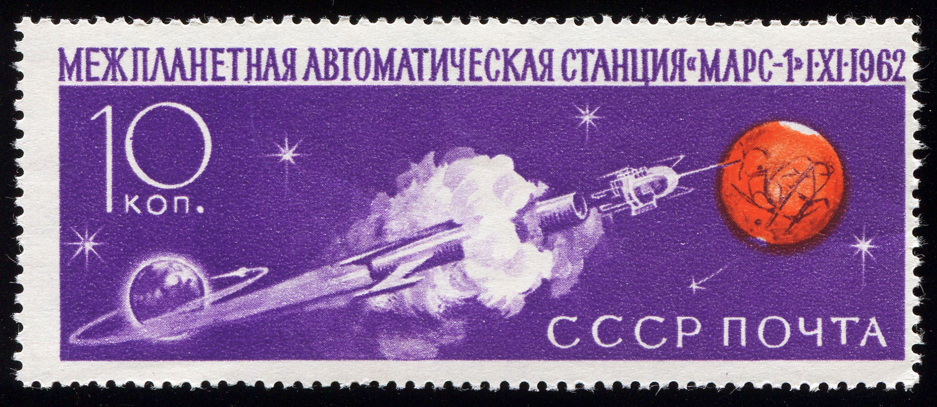 1) Кат. № 2756. Первые советские ИСЗ. 10 к. Цифры номинала белые.