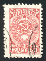 Тираж массовый. Цвет: кирпично-красная. Печать: типография. Перфорация гребенчатая 11 3/4 : 12 1/4. Бумага: простая.