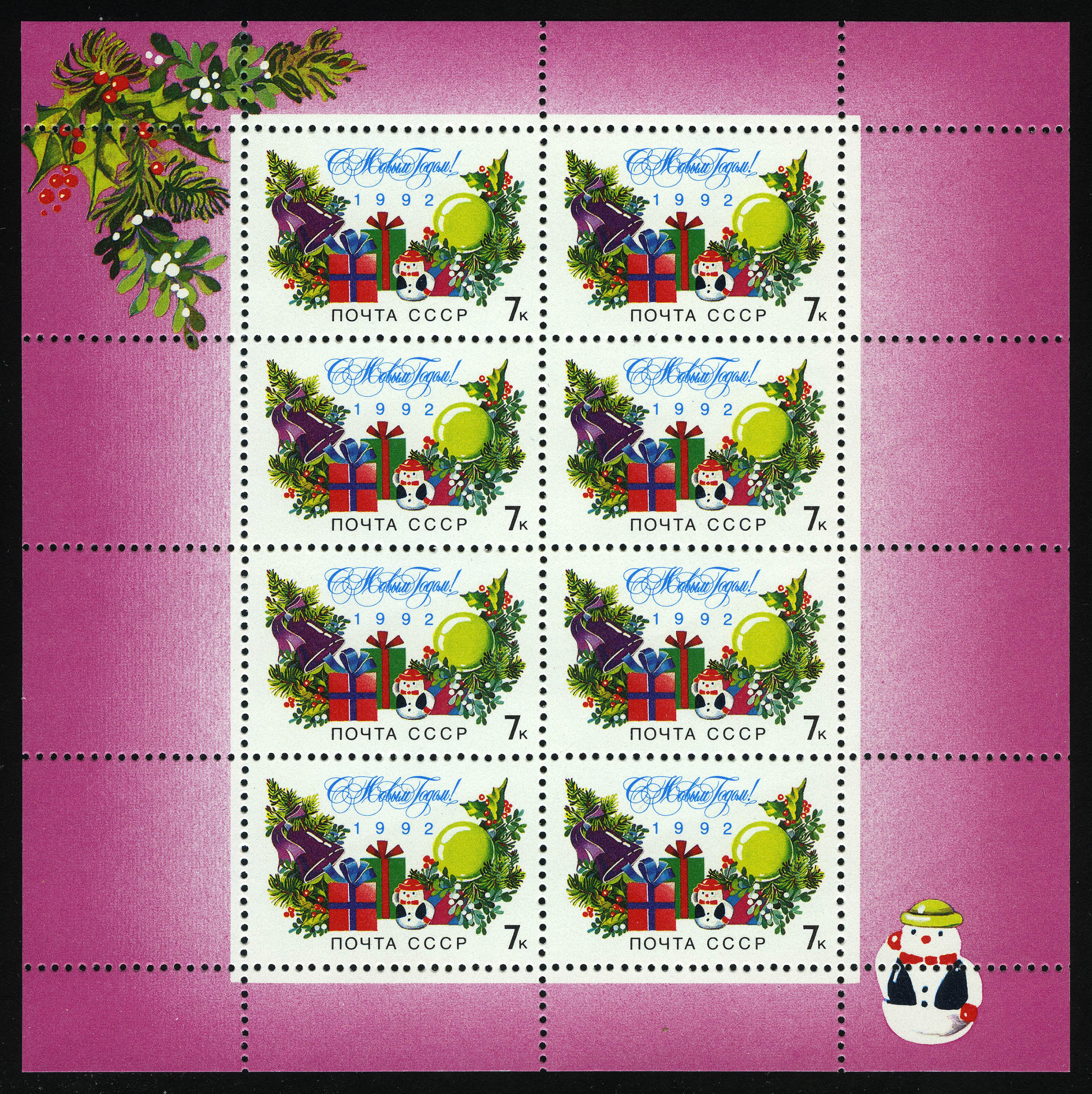 Малый лист 8 марок (2 х 4). Кат. № 6311. Ветви украшенной ёлки.