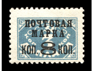 Кат. № 163 II A. Тип II. Надпечатка типографская черная "ПОЧТОВАЯ МАРКА к. 8 к. " на марке D12 A. 8 к. /3 к. Цвет: голубая. Печать: литография. oWmk – без водяного знака. Перфорация рамочная 12 1/4 : 12.