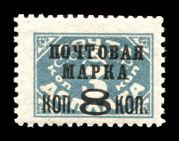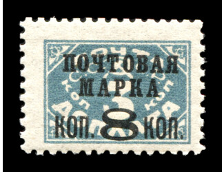 Кат. № 163 II A. Тип II. Надпечатка типографская черная "ПОЧТОВАЯ МАРКА к. 8 к. " на марке D12 A. 8 к. /3 к. Цвет: голубая. Печать: литография. oWmk – без водяного знака. Перфорация рамочная 12 1/4 : 12.