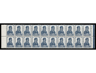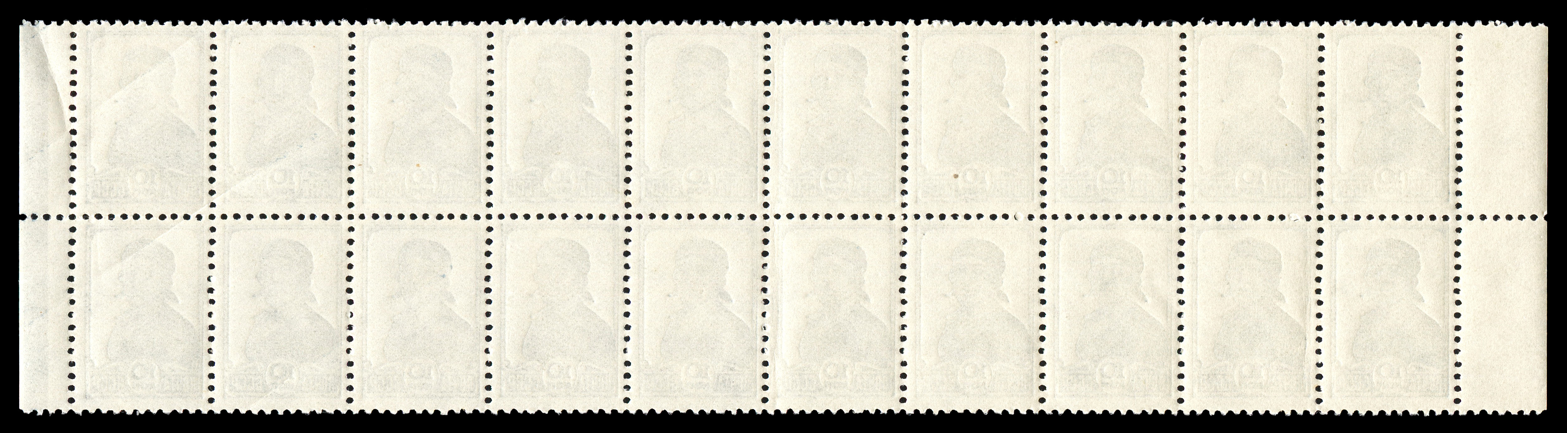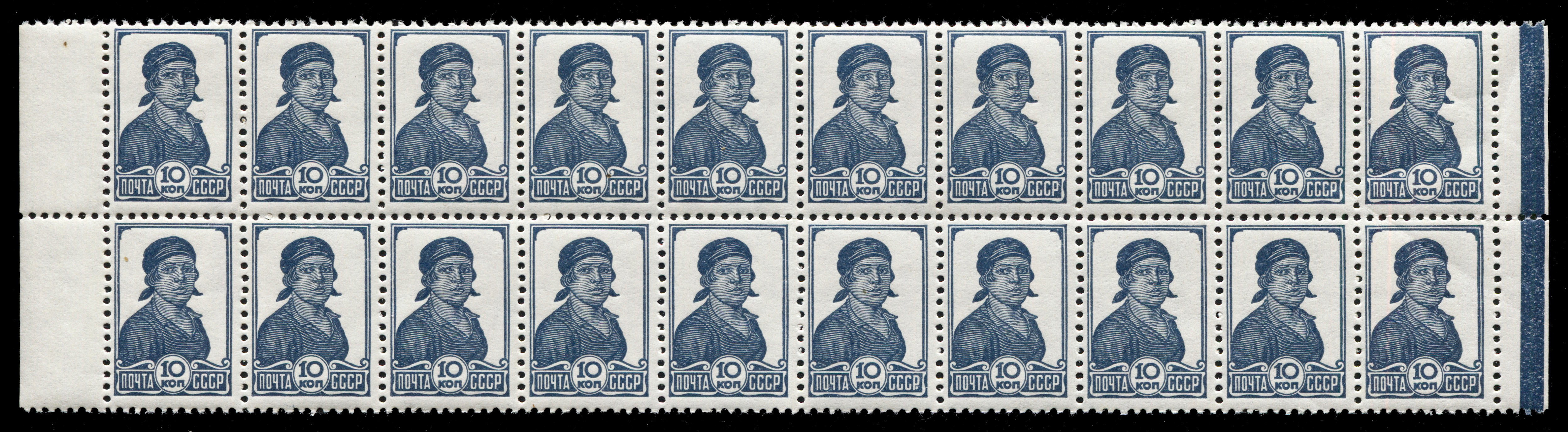 Кат. № 441. Часть листа (сцепка 20 марок). Рис. – 15,5 х 23 мм. Цвет: серо-синяя. Печать: типографская, oWmk – без водяного знака. Перфорация гребенчатая 12 : 12 1/4.