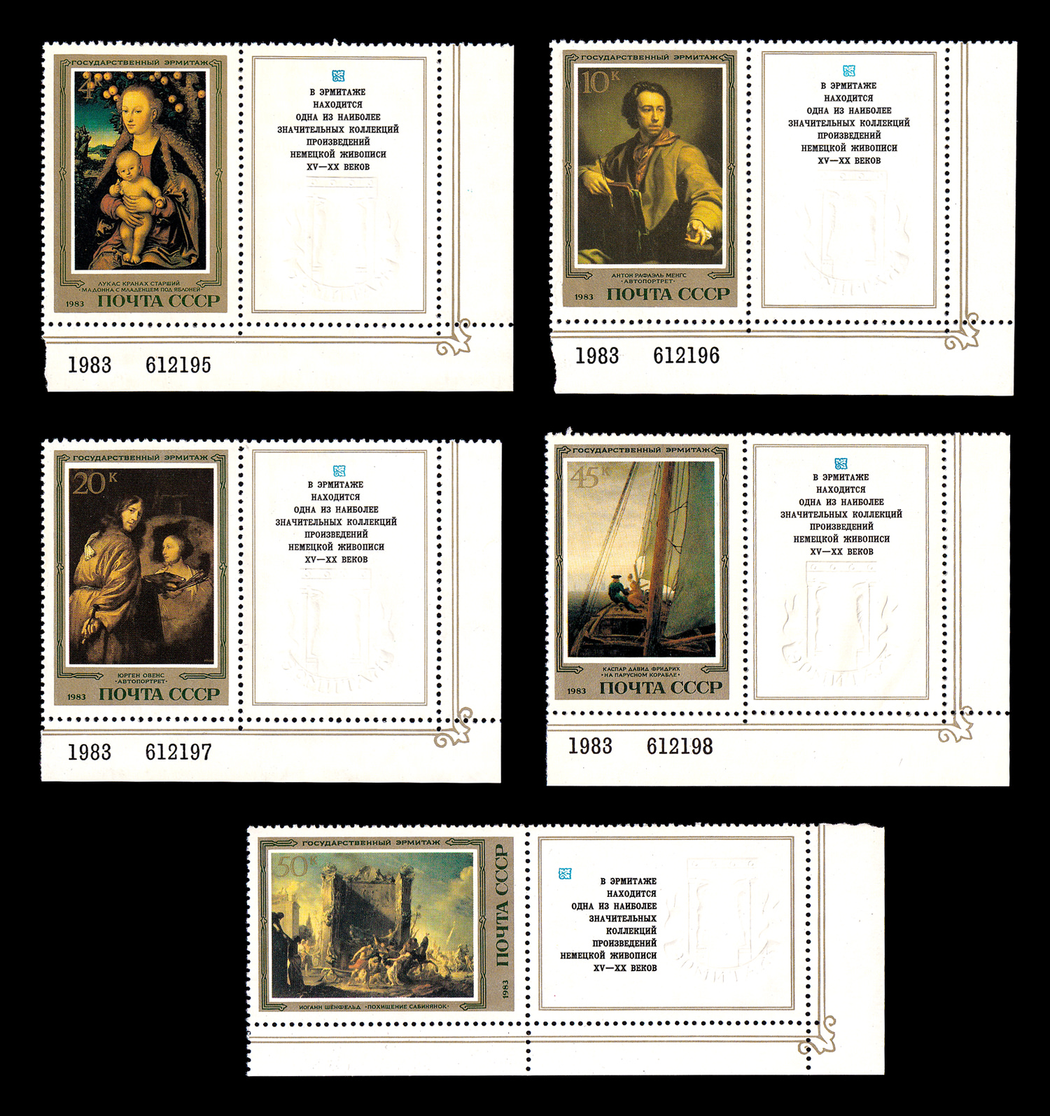 8). "Автопортрет". 20 к. Кат. № 5383. Тираж – 4 400 000. Перфорация гребенчатая 12 : 12 1/2. - Каспар Давид Фридрих (1774-1840). "На парусном корабле". 45 к. Кат. № 5384. Тираж – 3 700 000. Перфорация гребенчатая 12 : 12 1/2.