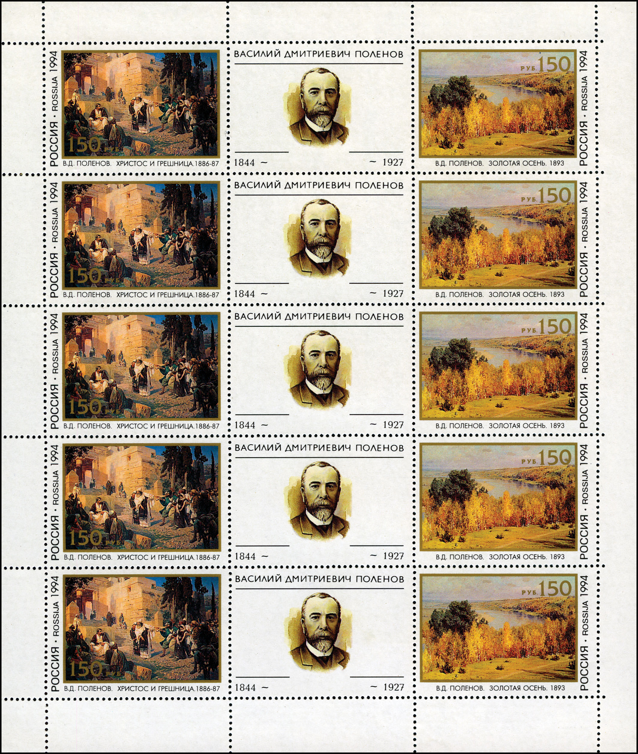 Малый лист 8 марок. Кат. № 1184 A. Тираж – 100 000. Печать: офсет с бронзовой пастой. Перфорация гребенчатая 12.