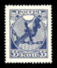 Разновидность. Кат. № 1Ka. Тонкая буква «О» в слове «РОССIЯ» (поз. 99, I тираж).Цвет: синяя. Печать: типографская. Бумага: с верт. меловой сеткой, oWm. Перфорация гребенчатая 13 1/2.