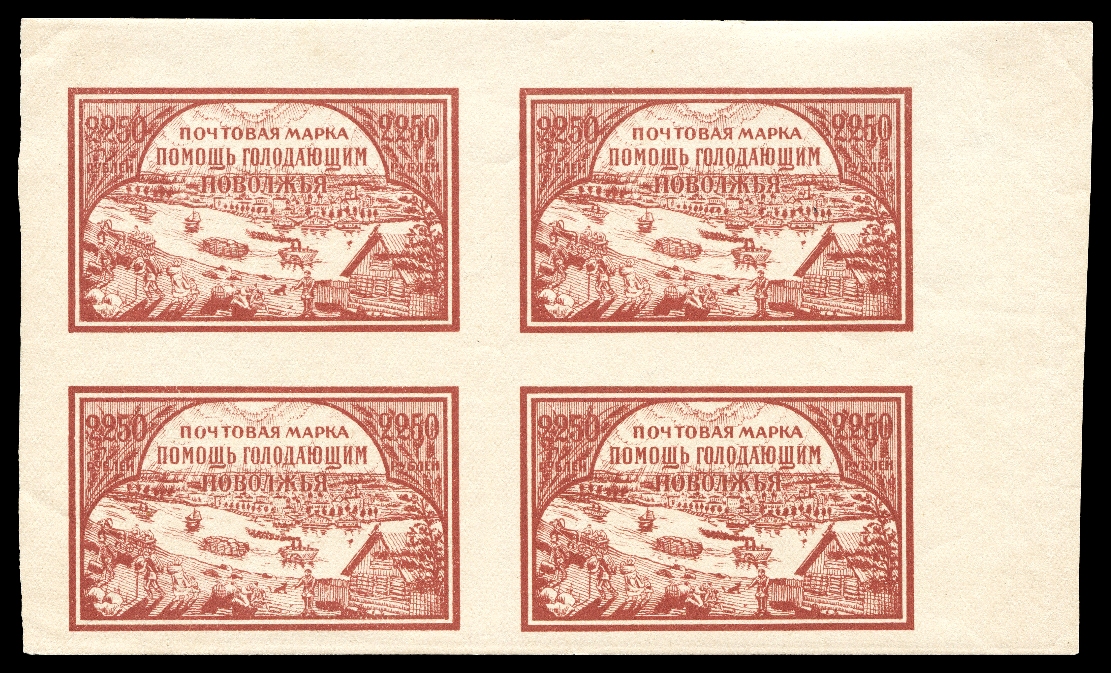 Квартблок. Кат. № 20 CP I, 20 CP II. Верхние марки – труба светлая, нижние марки – труба темная. Цвет: красная. Печать: типографская. Бумага: хлопчатая. Без перфорации.