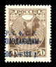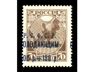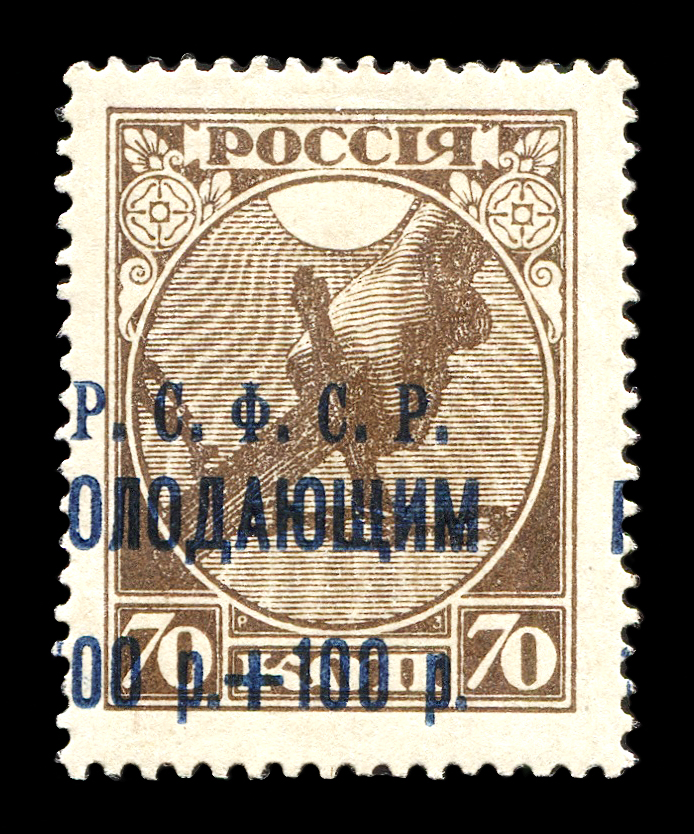 Кат. № 22Tc. Сдвиг надпечатки. Надпечатка типографская синяя текста "Р.С.Ф.С.Р. ГОЛОДАЮЩИМ" и нового номинала на марке 2. Тираж – 1 500 000.