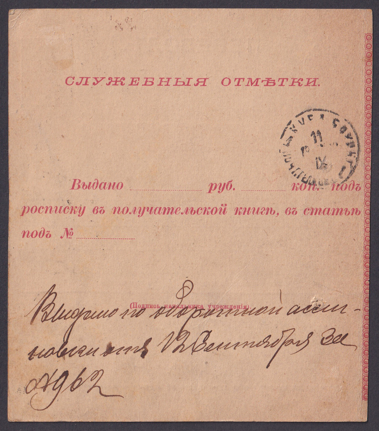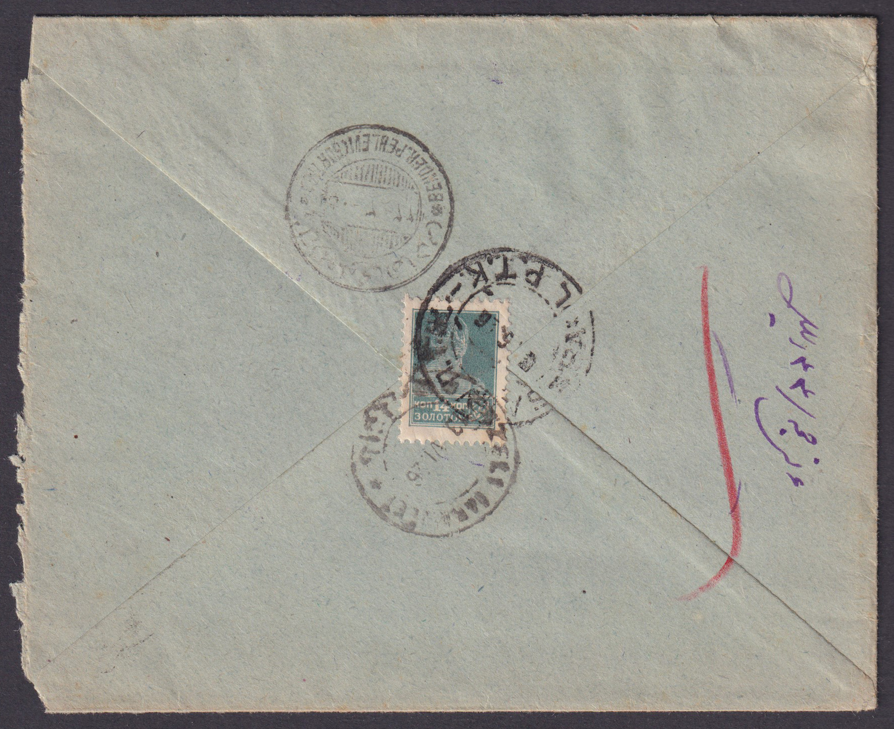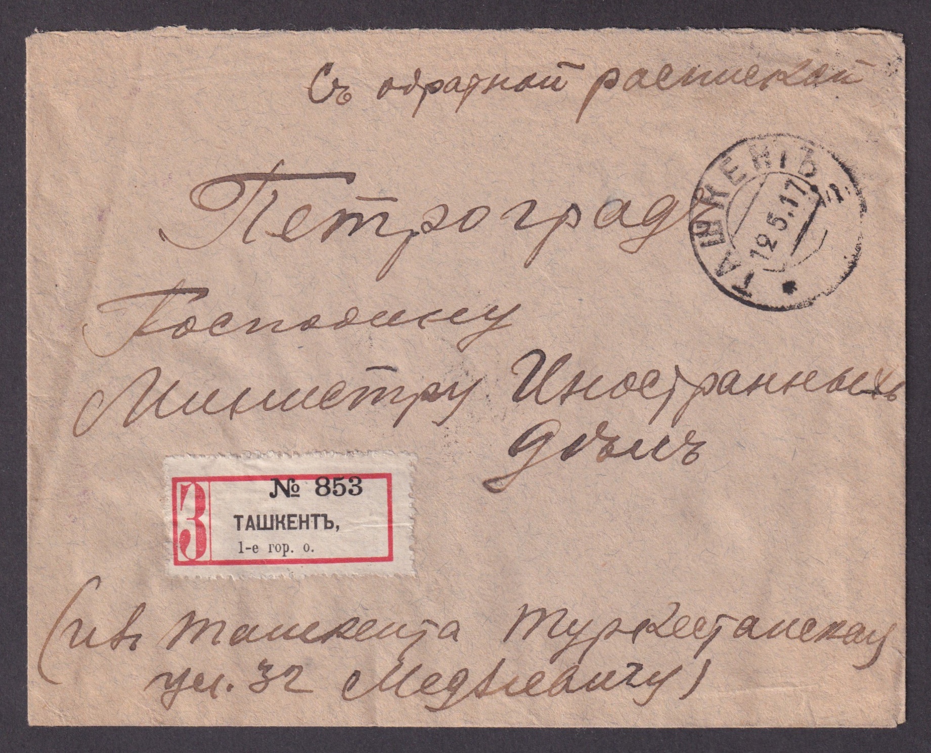 Российская империя. Заказное письмо из Ташкента в Петроград со штампом «Отд. дост правит и диплом кор.».