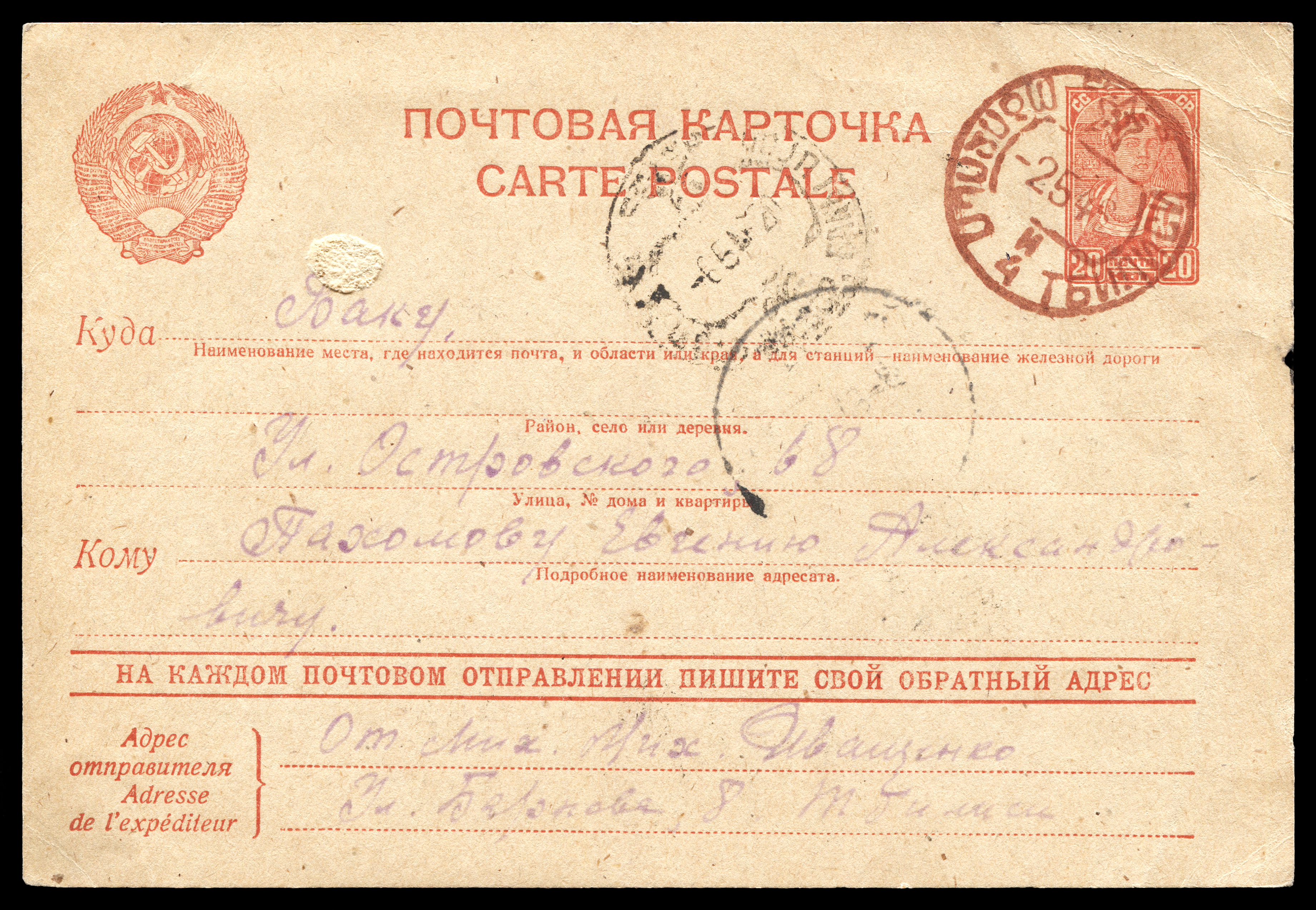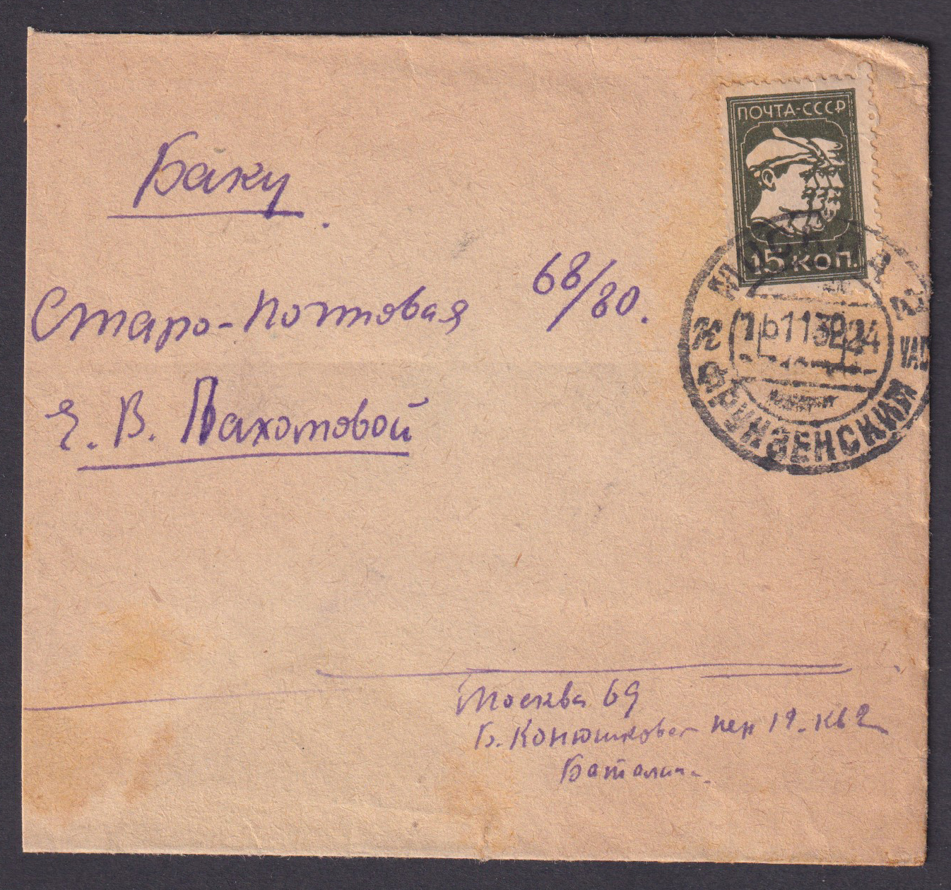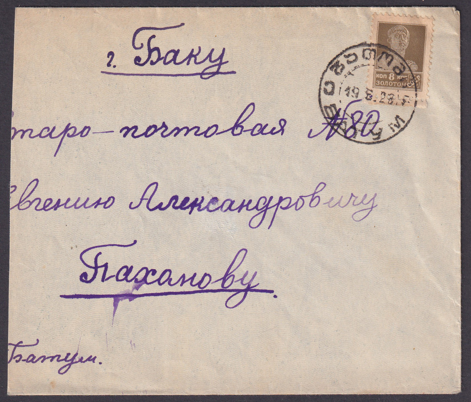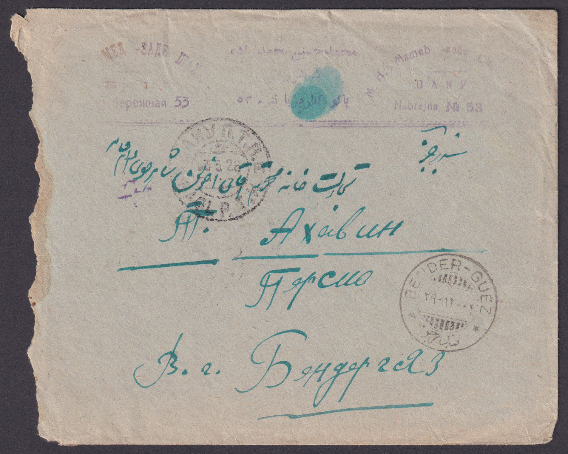 СССР. Почтовое отправление из Баку 08.03.26 в Бендер-э-Газ. Франкировано стандартной маркой.