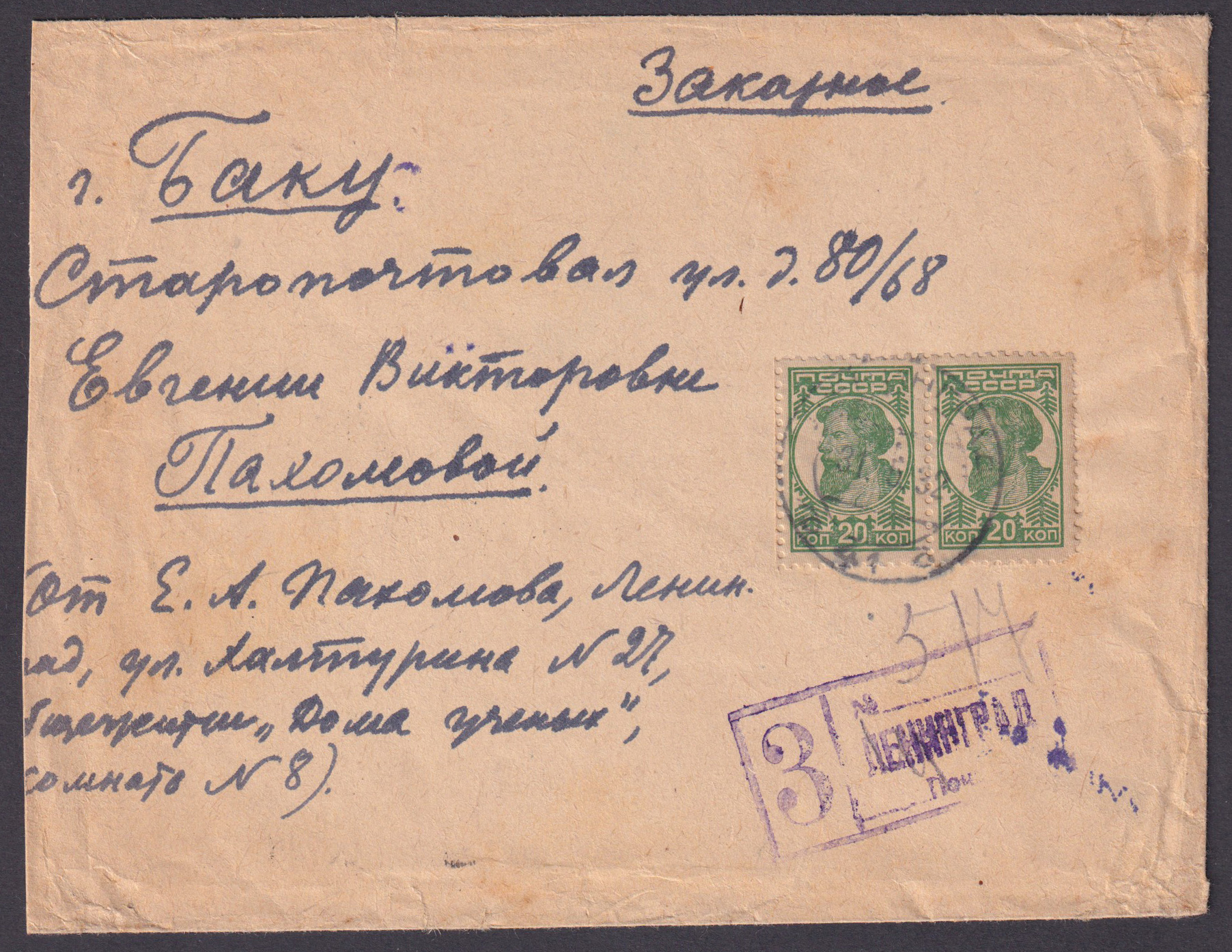 Заказное отправление из Ленинграда 31.05.32 в Баку 06.06.32. Франкировано Стандартными марками. Оригинальный заказной штамп.