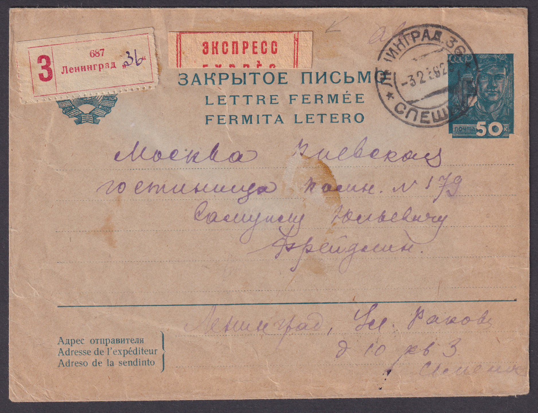 СПЕШНОЕ. Из Ленинграда 03.02.39 в Москву 03.02.39 с этикеткой «ЭКСПРЕСС» на лицевой части конверта. Сзади, вероятно, отклеилась марка.