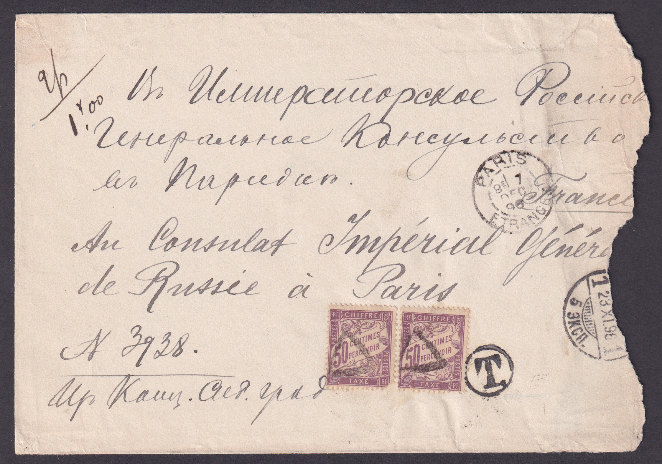 Служебное отправление из Канцелярии градоначальника СПб 23.11.96 в Российское Консульство в Париже 07.12.96 с отметкой доплаты.