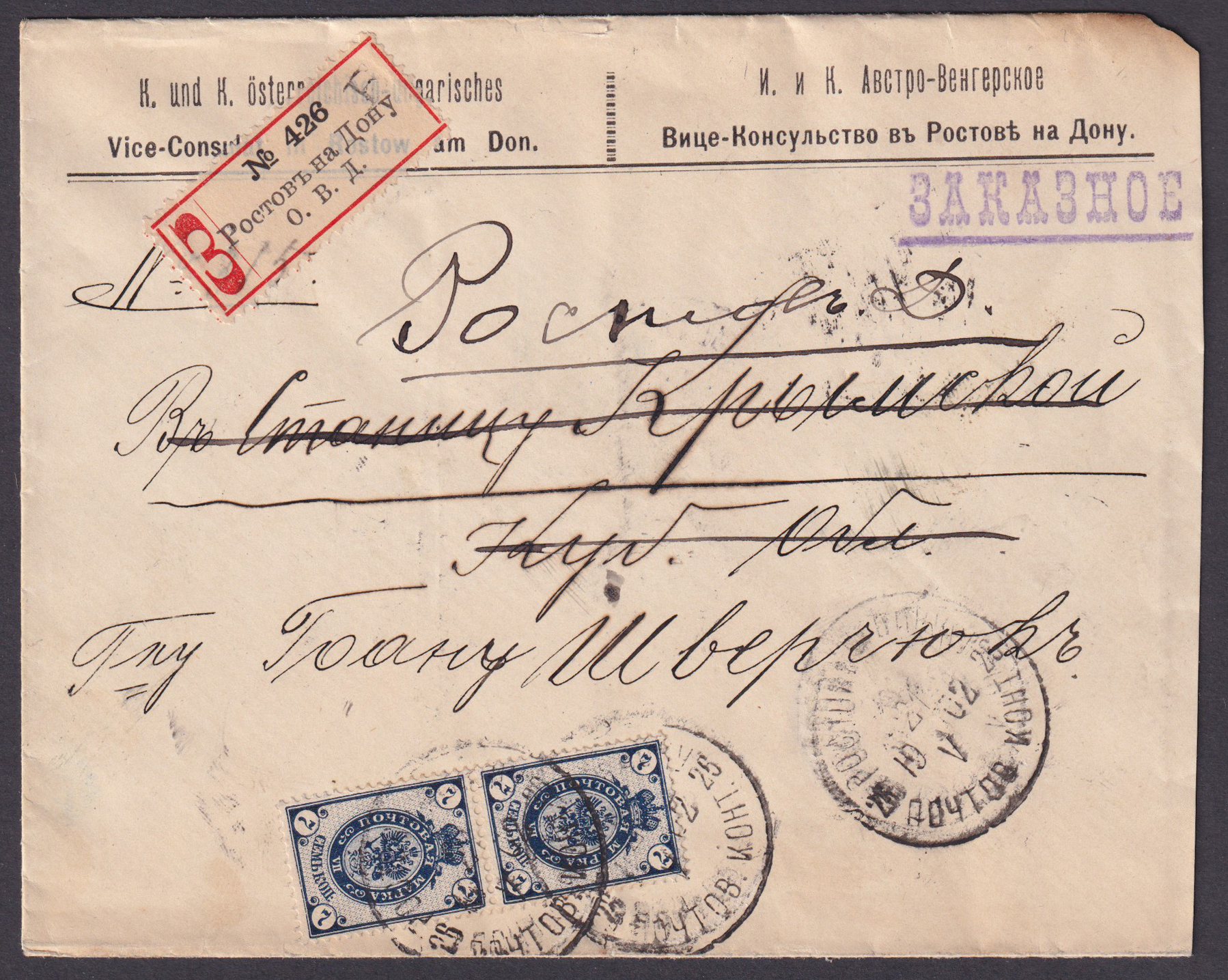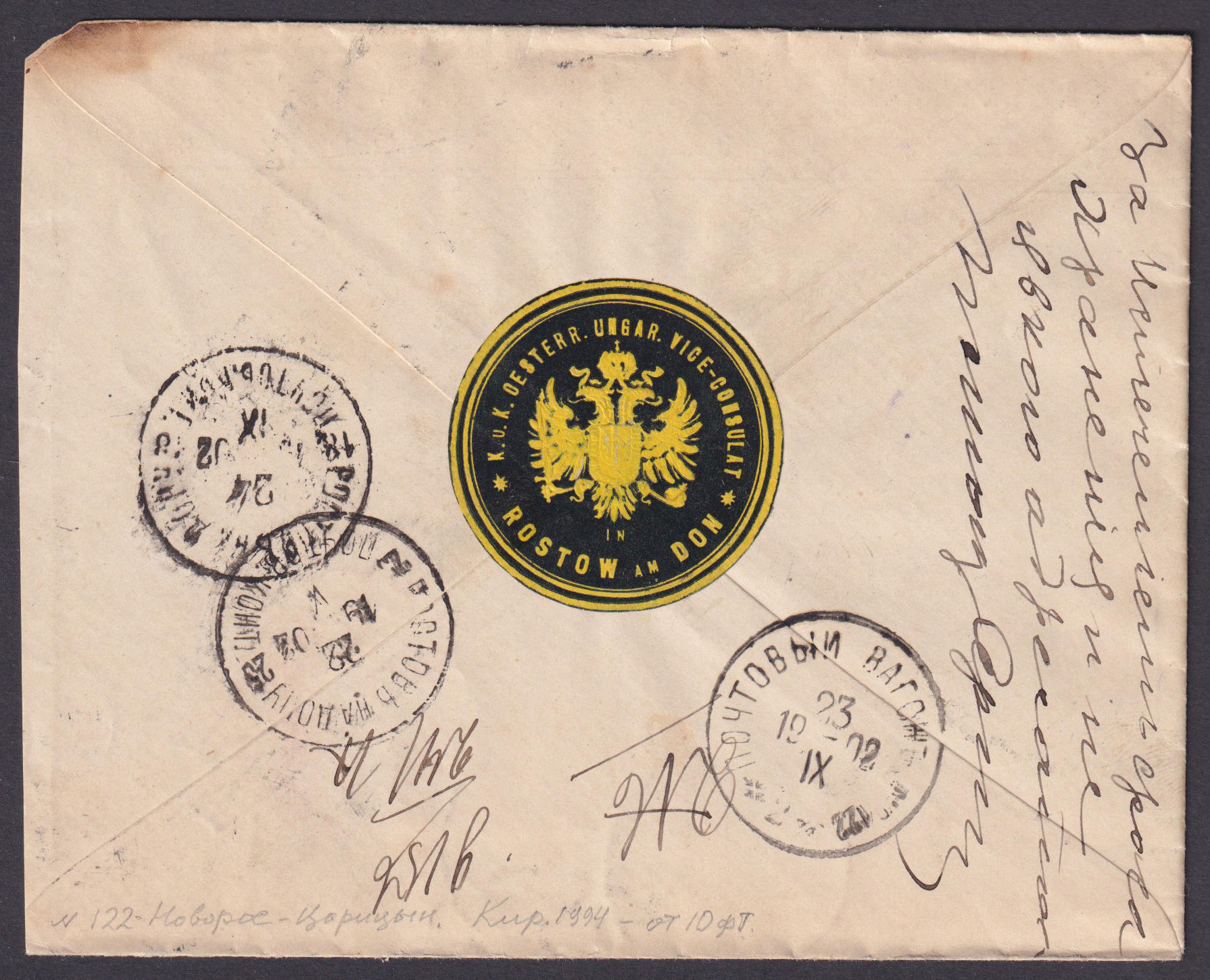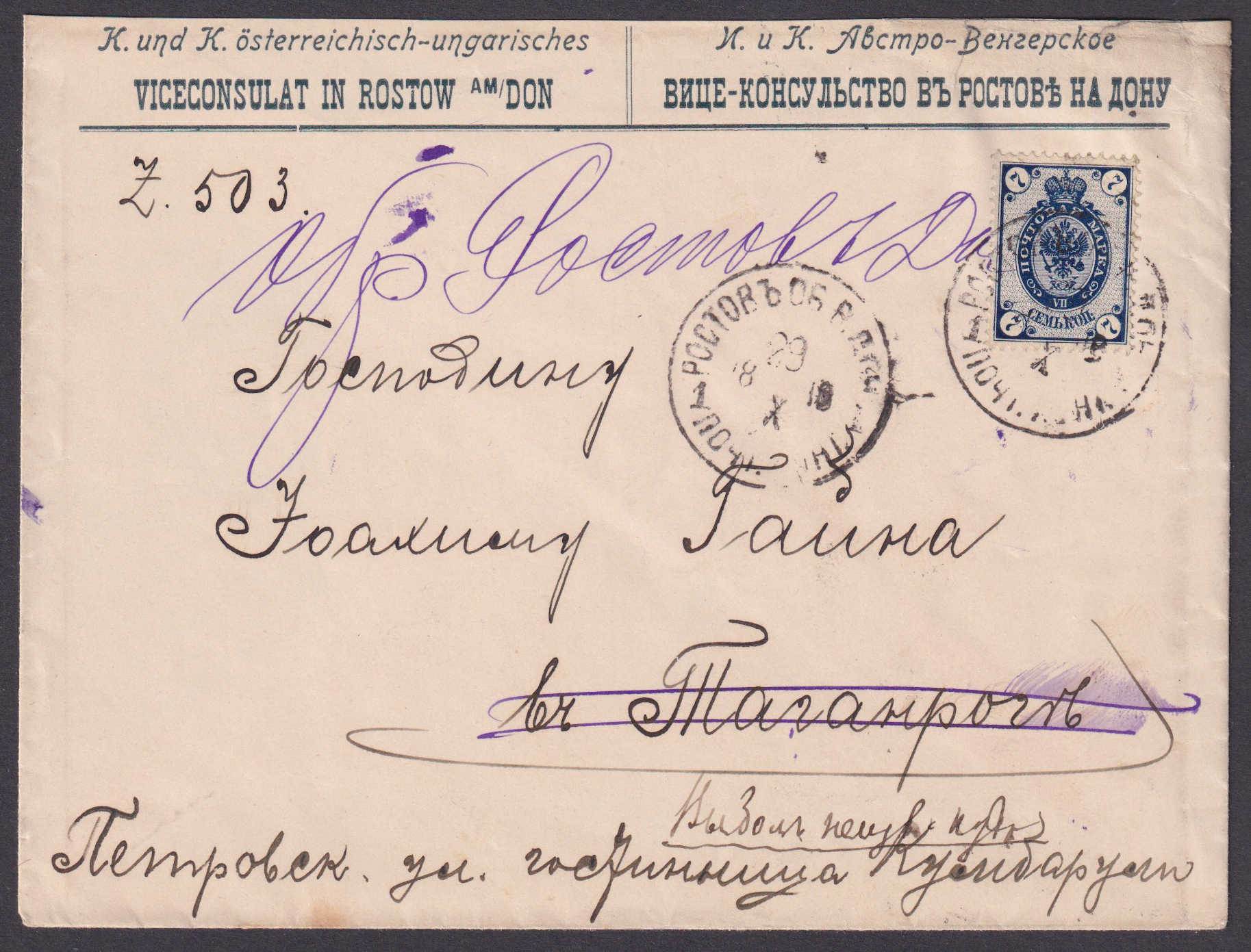 Отправление на бланке Австро-Венгерского консульства в Ростов-на-Дону 29.10.98 в Таганрог 02.11.98. Отметка почтмейстера об отсутствии адресата и возврат в Ростов-на-Дону.