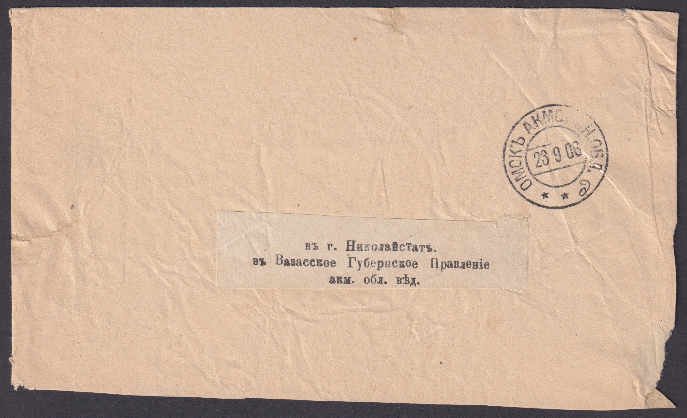 Российская империя. Служебное письмо из Омска, Акмолинская обл. 23.09.06 в Николайстад 15.10.06.