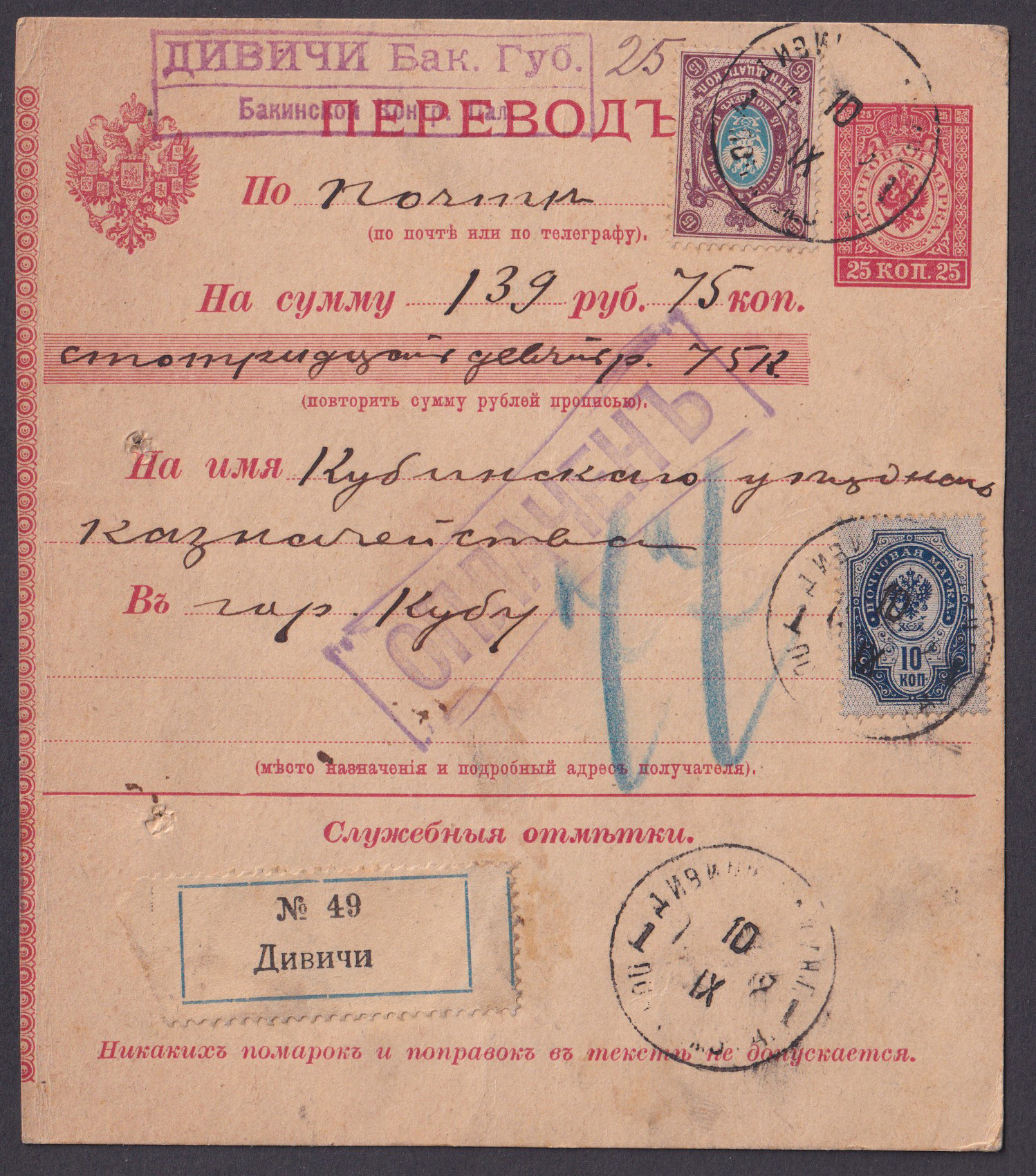 Российская империя. Бланк почтового перевода из Дивичи на Кубу.