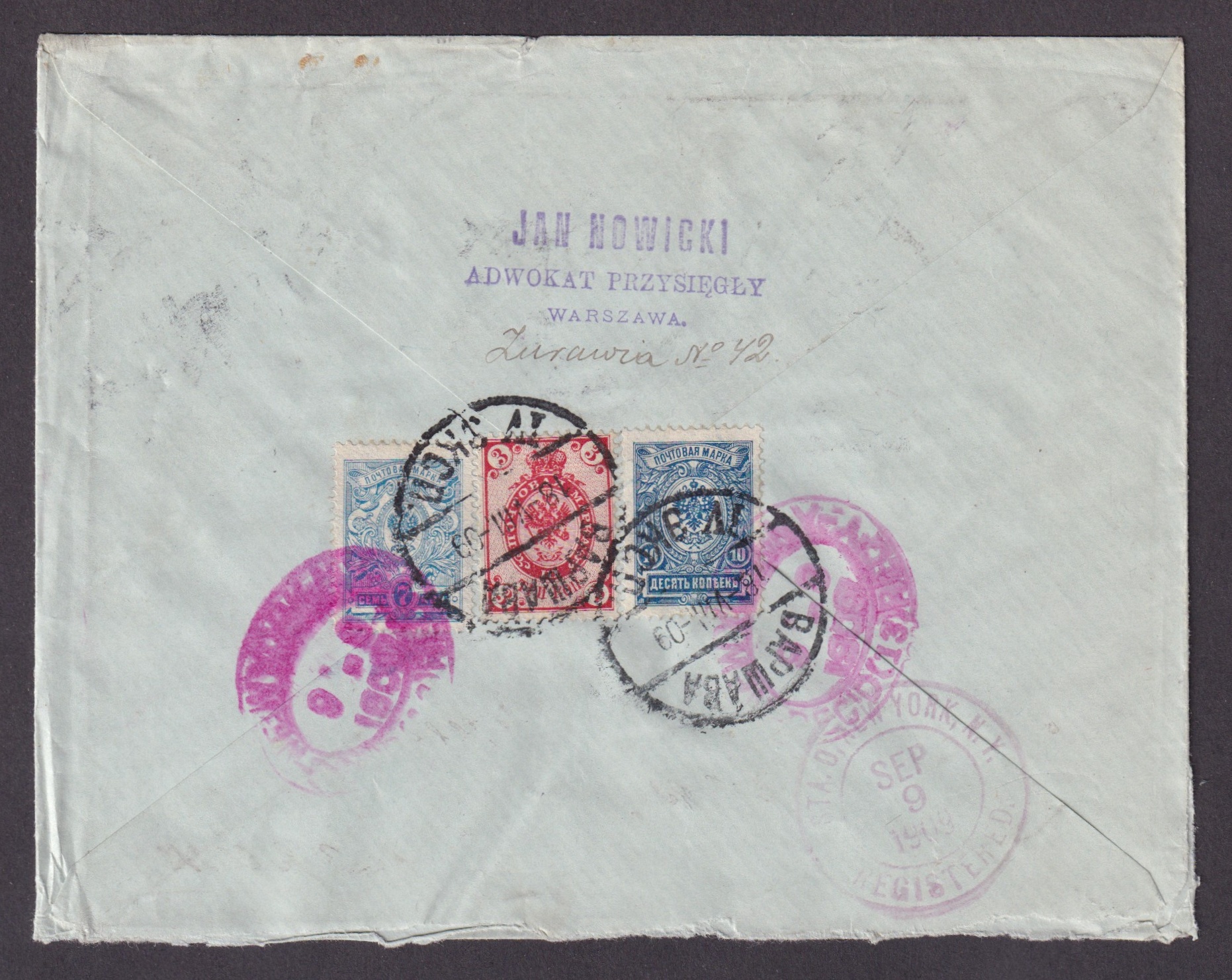 Российская империя. Заказное письмо из Варшавы в Нью-Йорк.