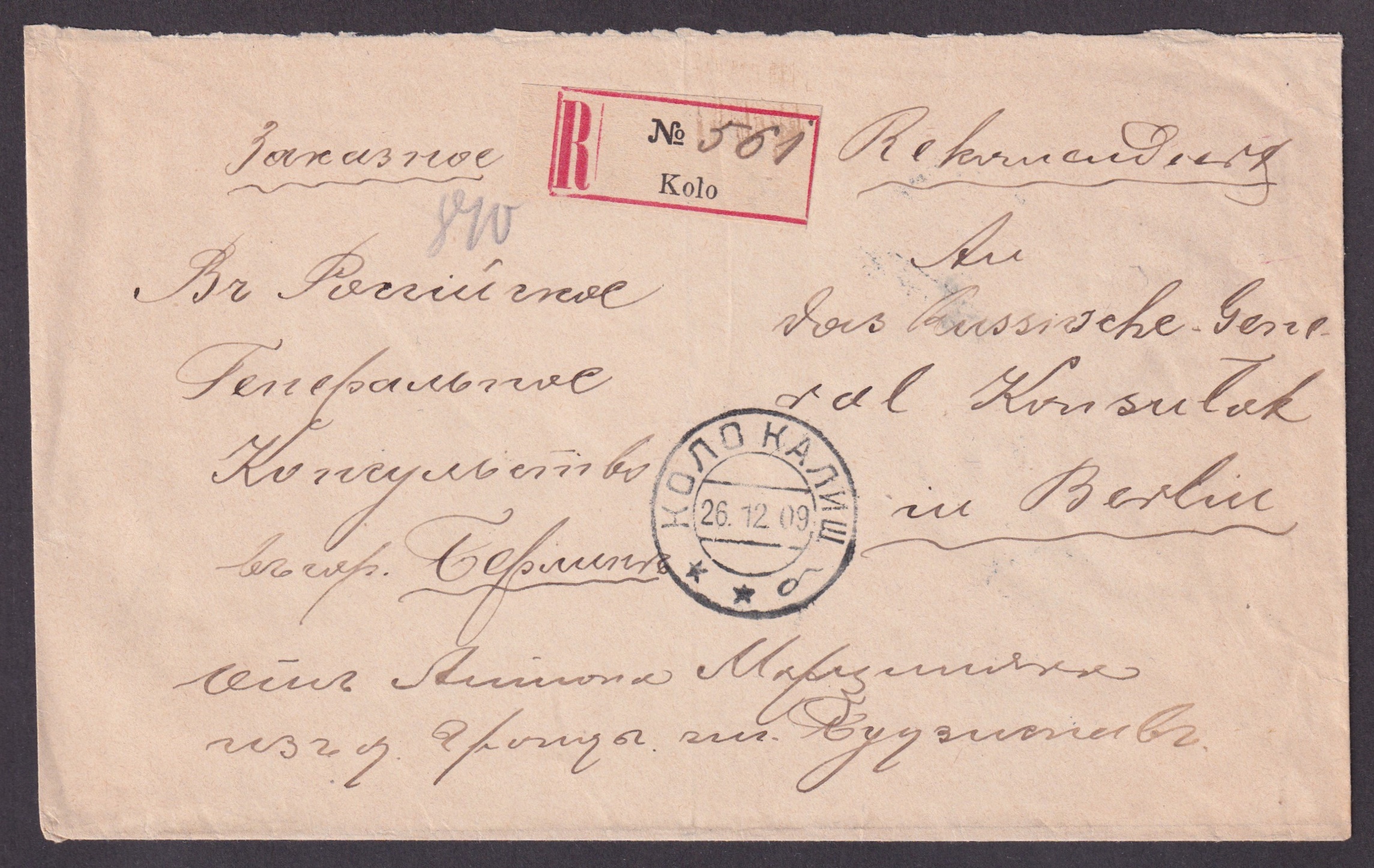 Российская империя. Заказное письмо из Коло Калишской губ. в Берлин. Франк-но ранним выпуском 10 коп..