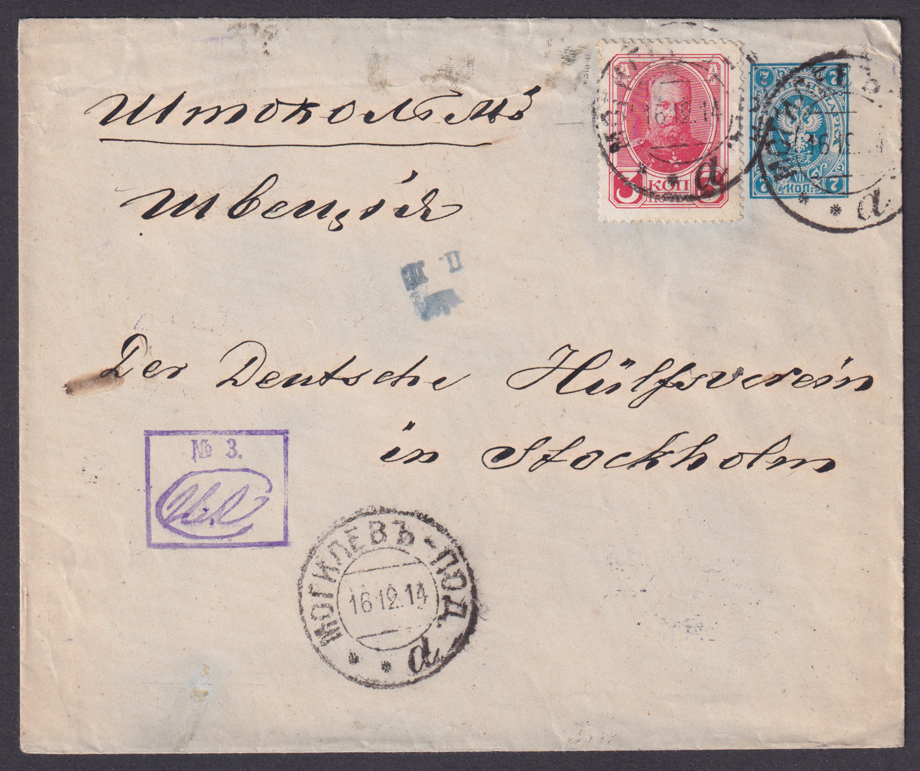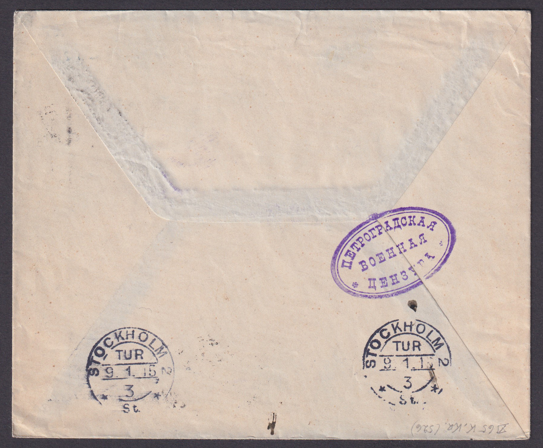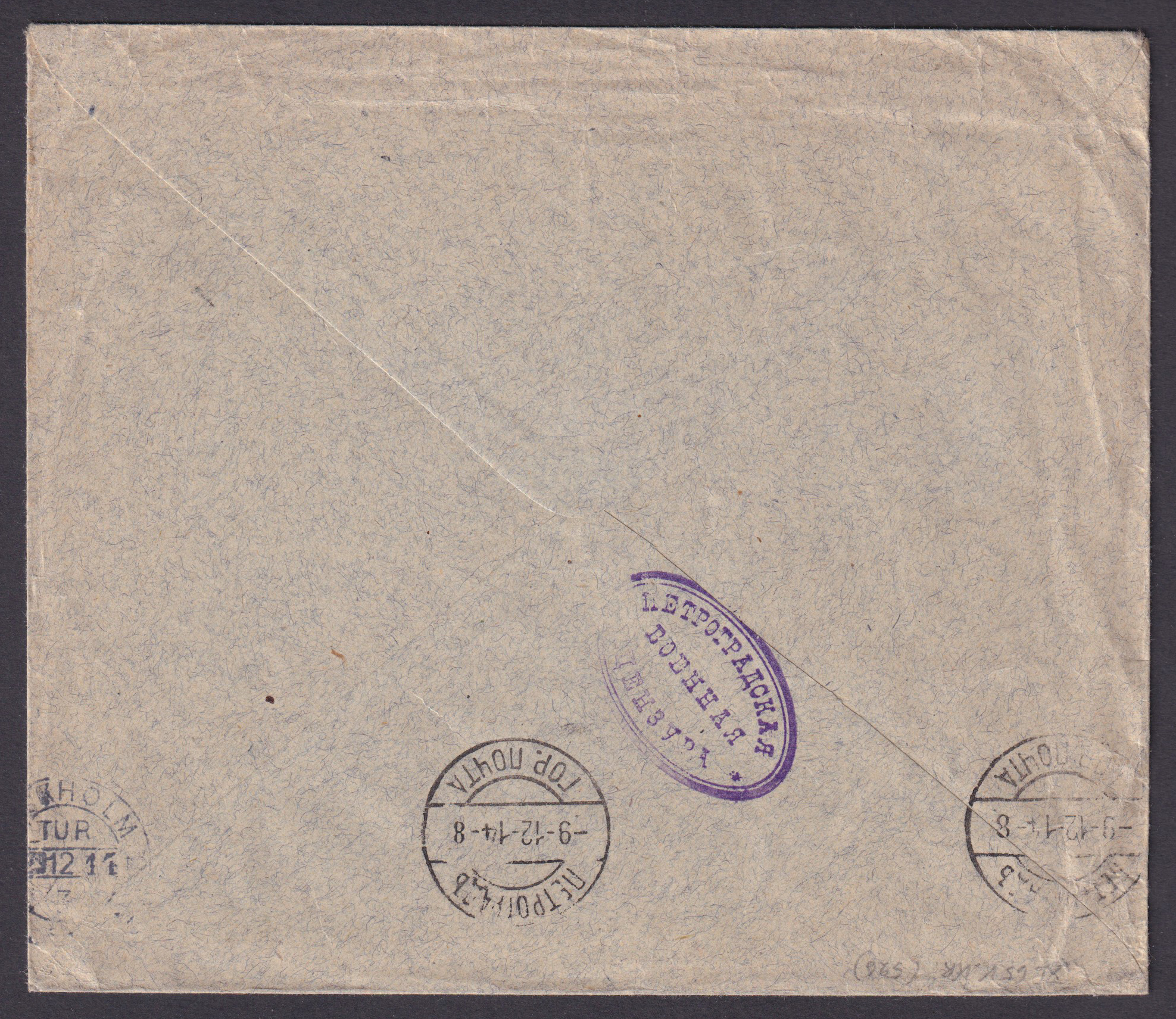 Отправление из Могилёва 16.12.14 с отметками Петроградской Военной цензуры №3 в Стокгольм 09.01.15.