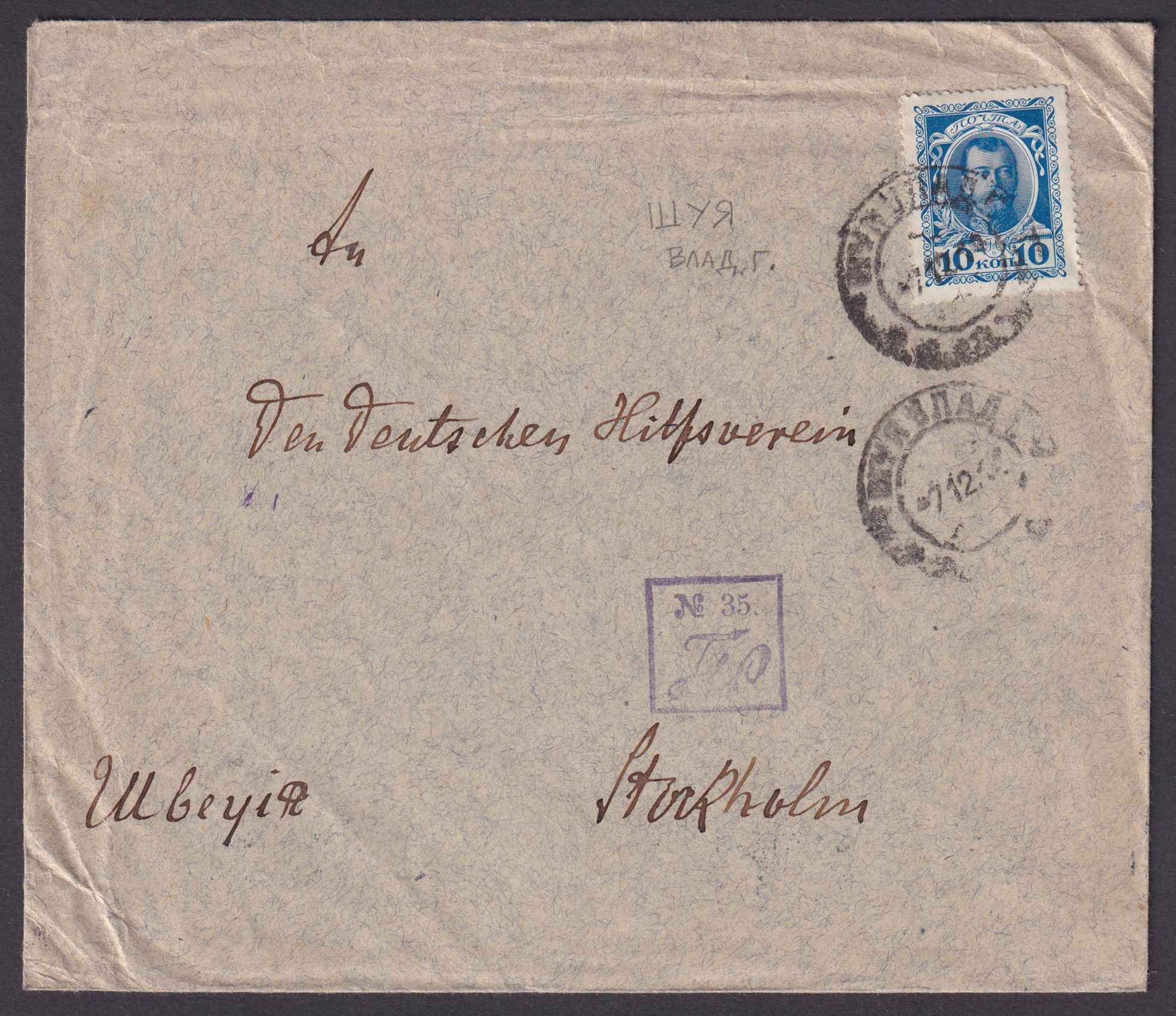 Отправление из Шуя 07.12.14 в Стокгольм. 29.12.14 через Петроград. 09.12.14 с отметками военной цензуры на лицевой и задней сторонах.