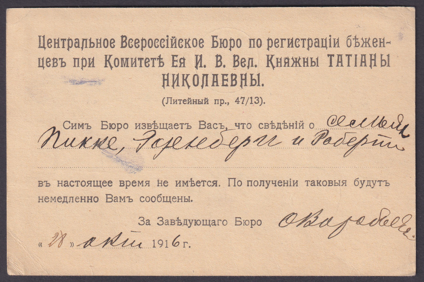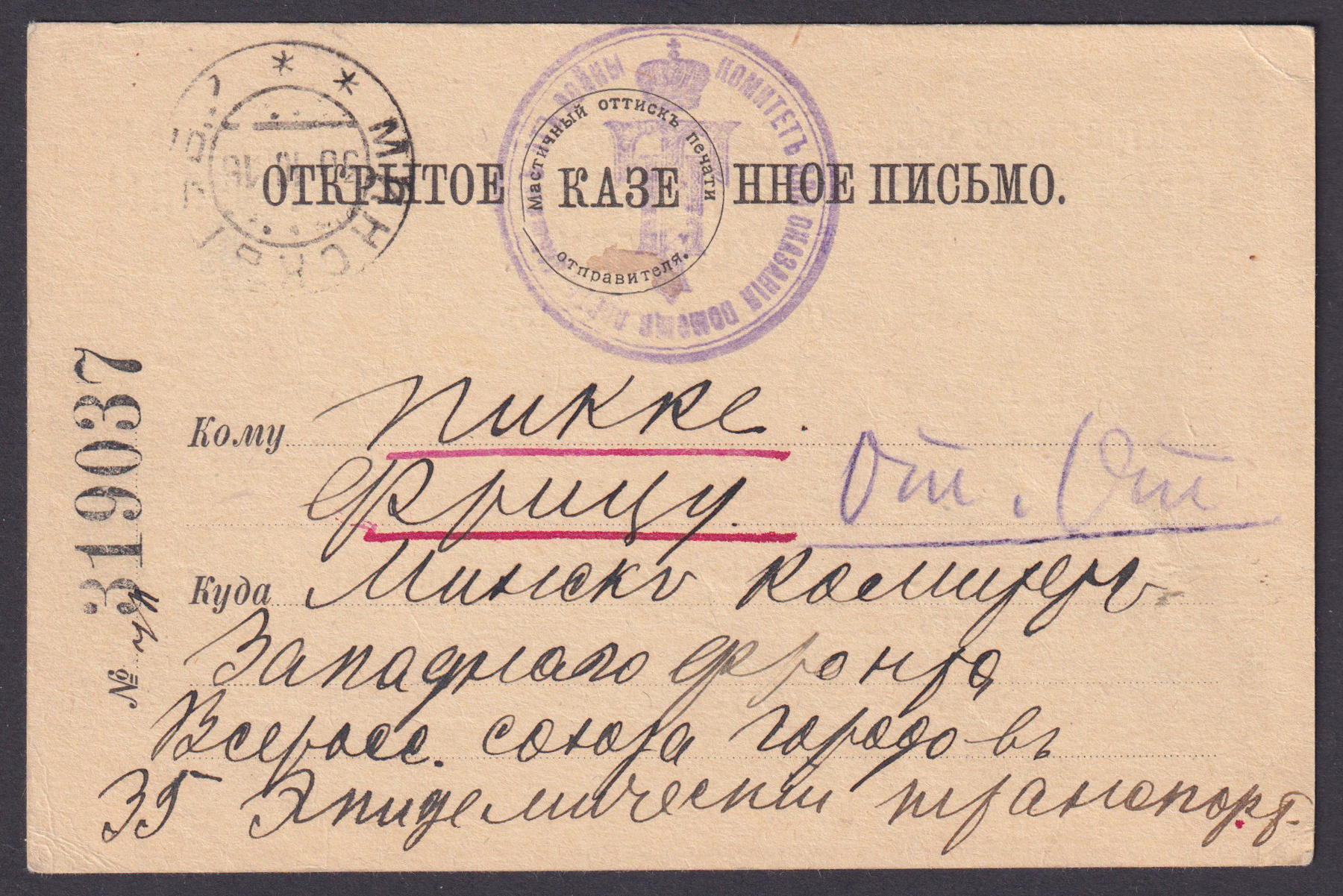 Казённое письмо на бланке Комитета Великой Княжны Татьяны. Из Петрограда 28.10 в Минск 30.10.