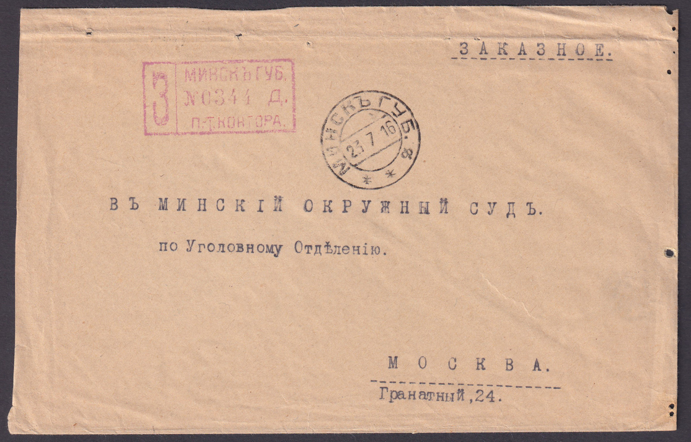 Российская империя. Заказное служебное из Минской губернии 23.07.16 в Москву 25.07.16.