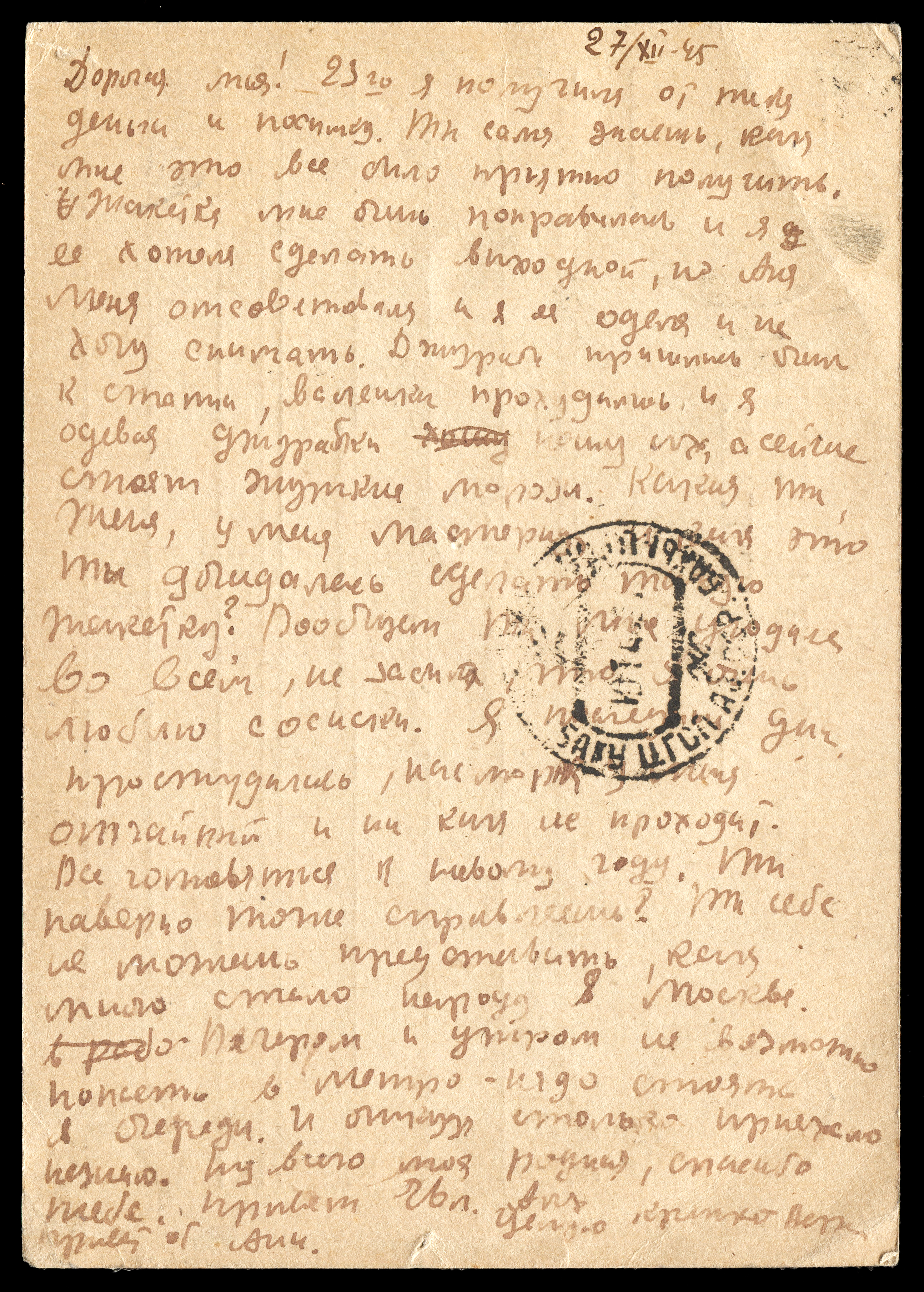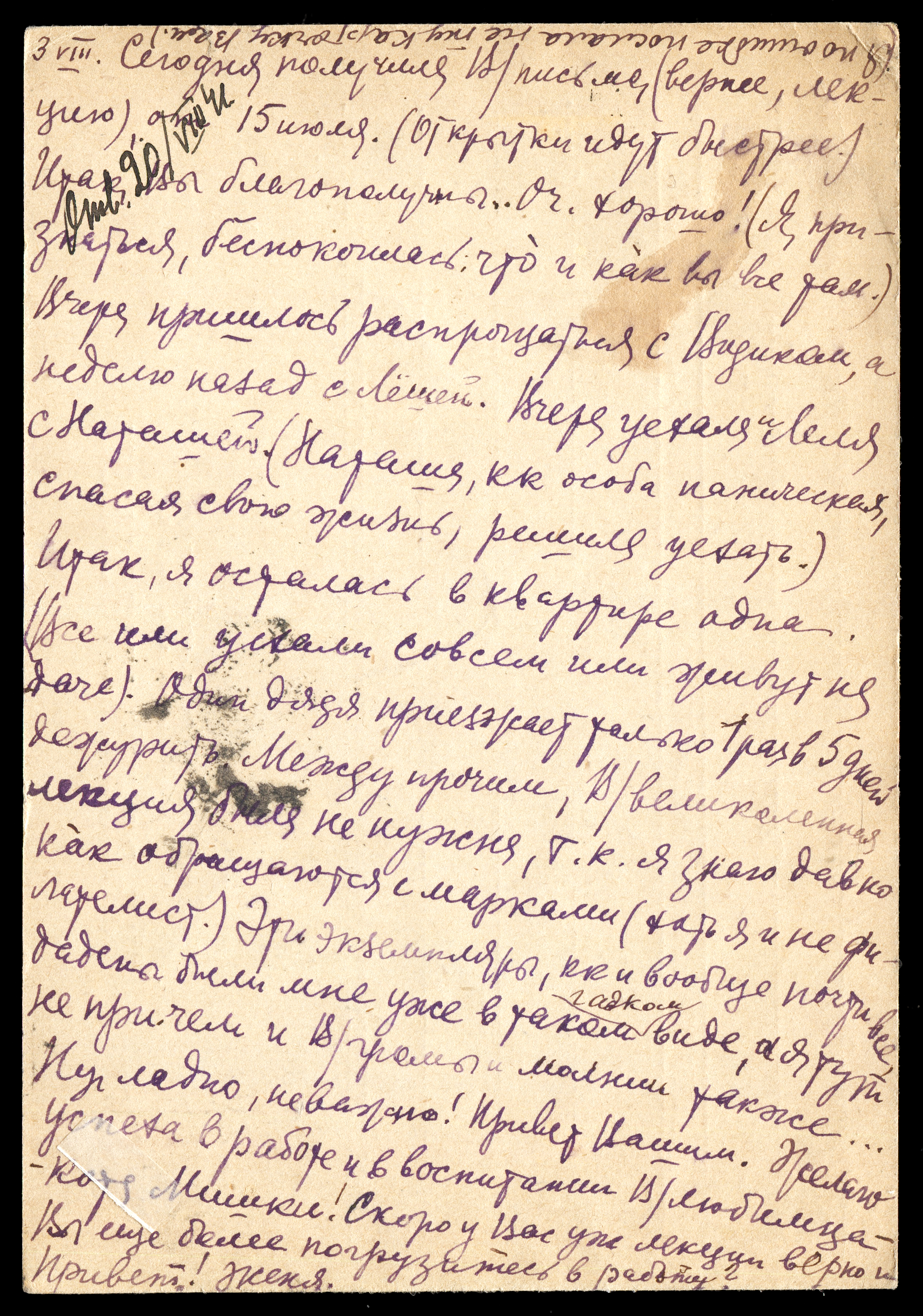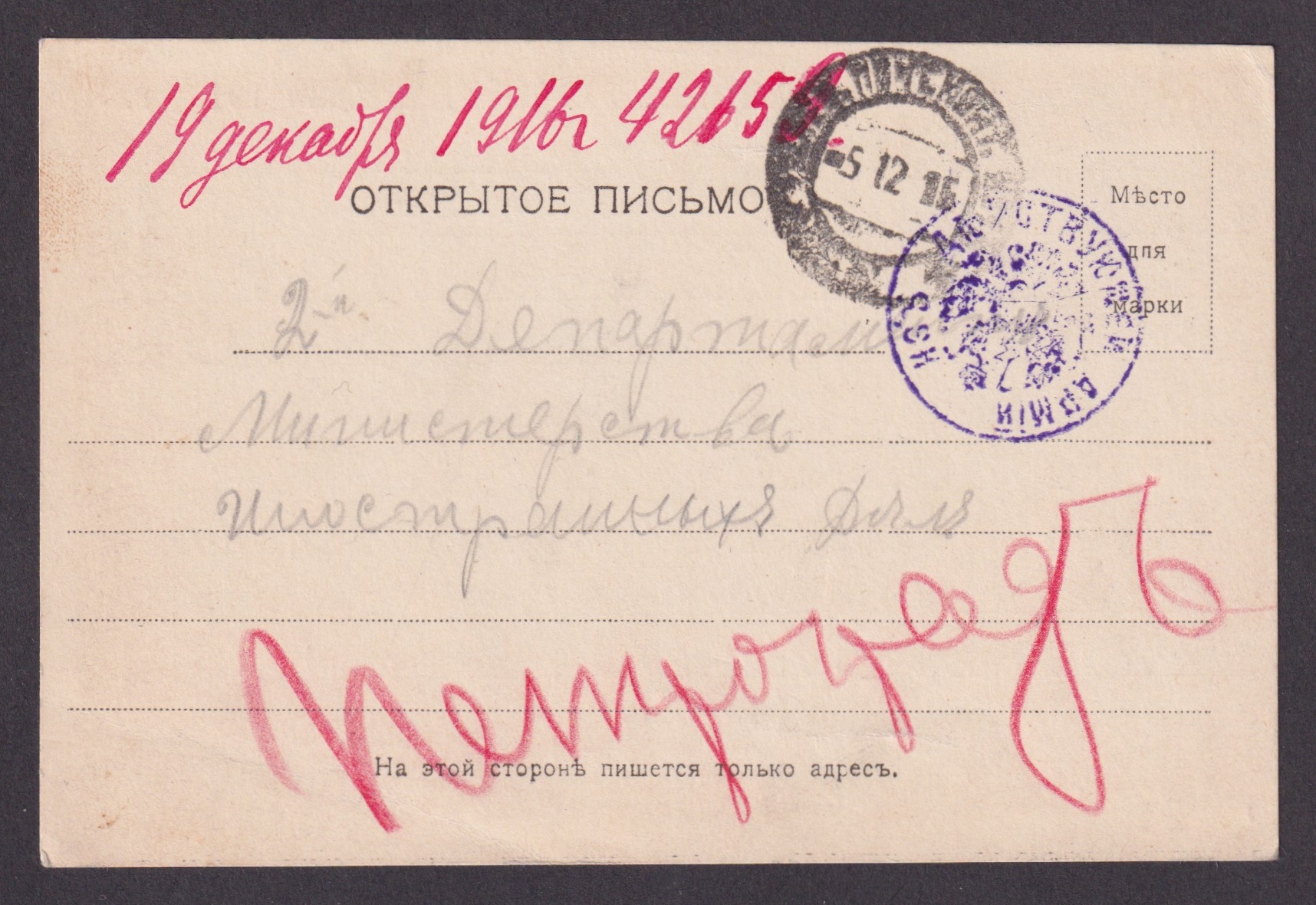 Служебное из Архангельска 13.08.15 с отметкой «ТЕЛЕФОНО-РАЗВЕДОЧНОЙ КОМАНДЫ». Также имеются отметки цензора и штампы о прибытии от 24.09.15 и марки налогового сбора.