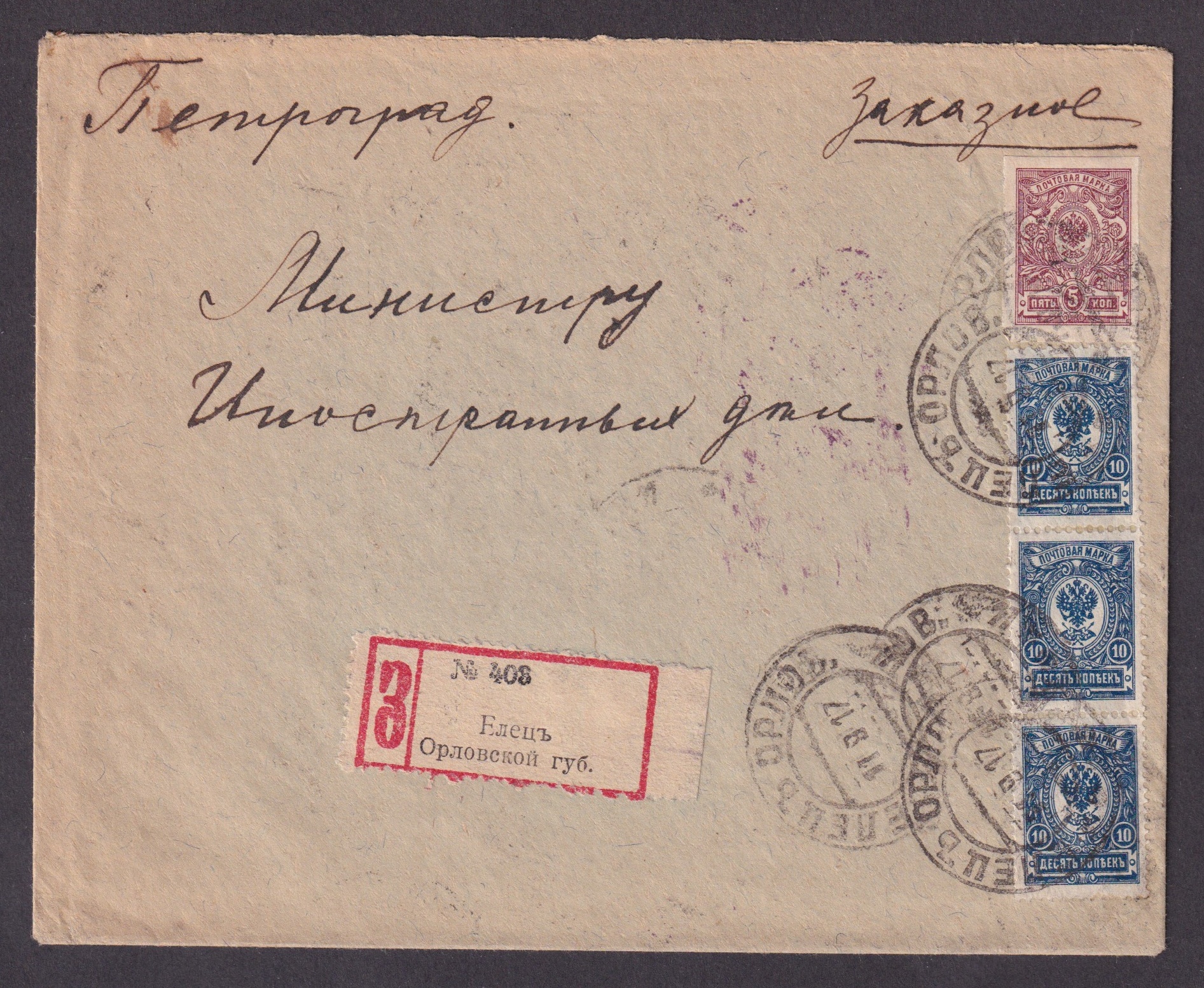 Российская империя. Заказное письмо из Ельца в Петроград со штампом «Отд. дост. правит и диплом кор.».