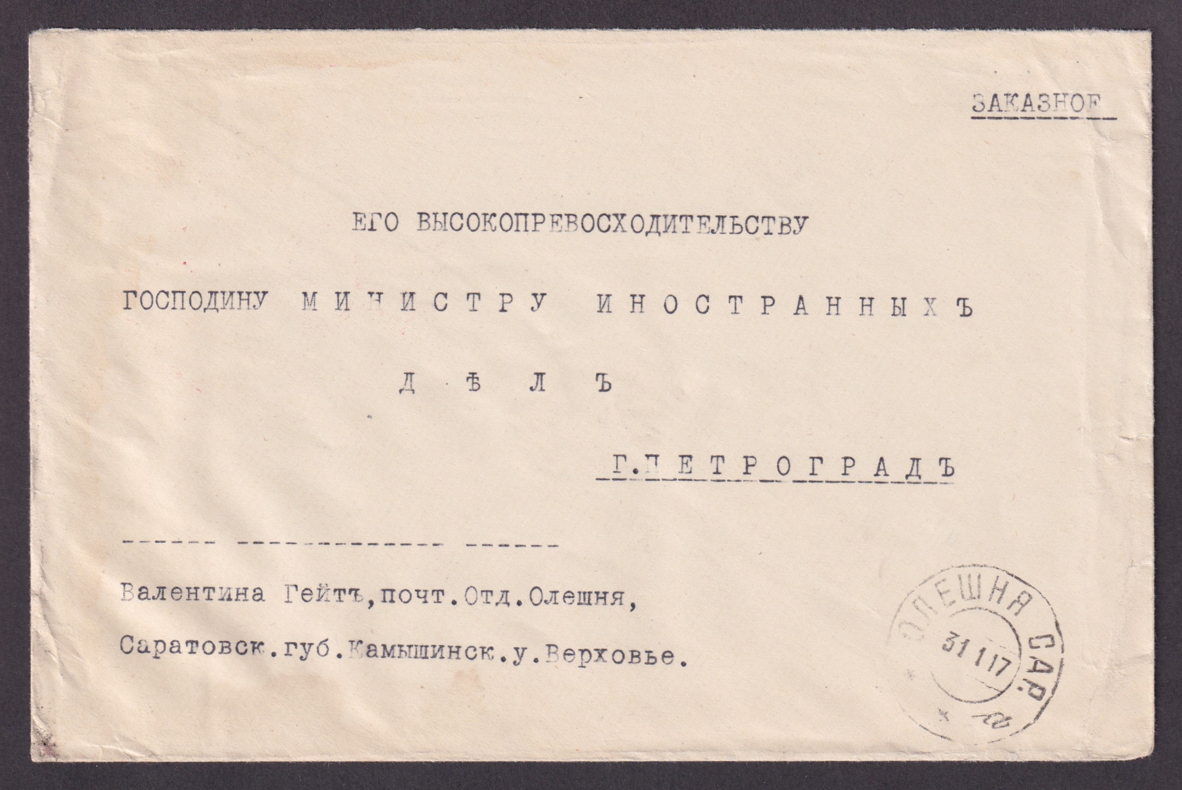 Российская империя. Почтовое отправление из Олешня в Петроград.