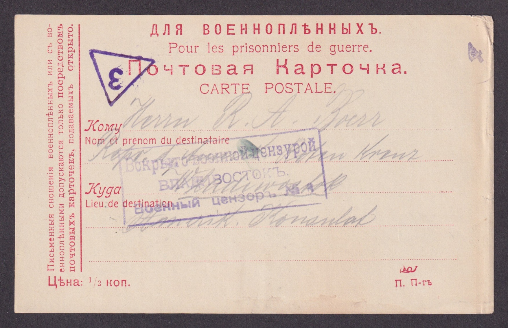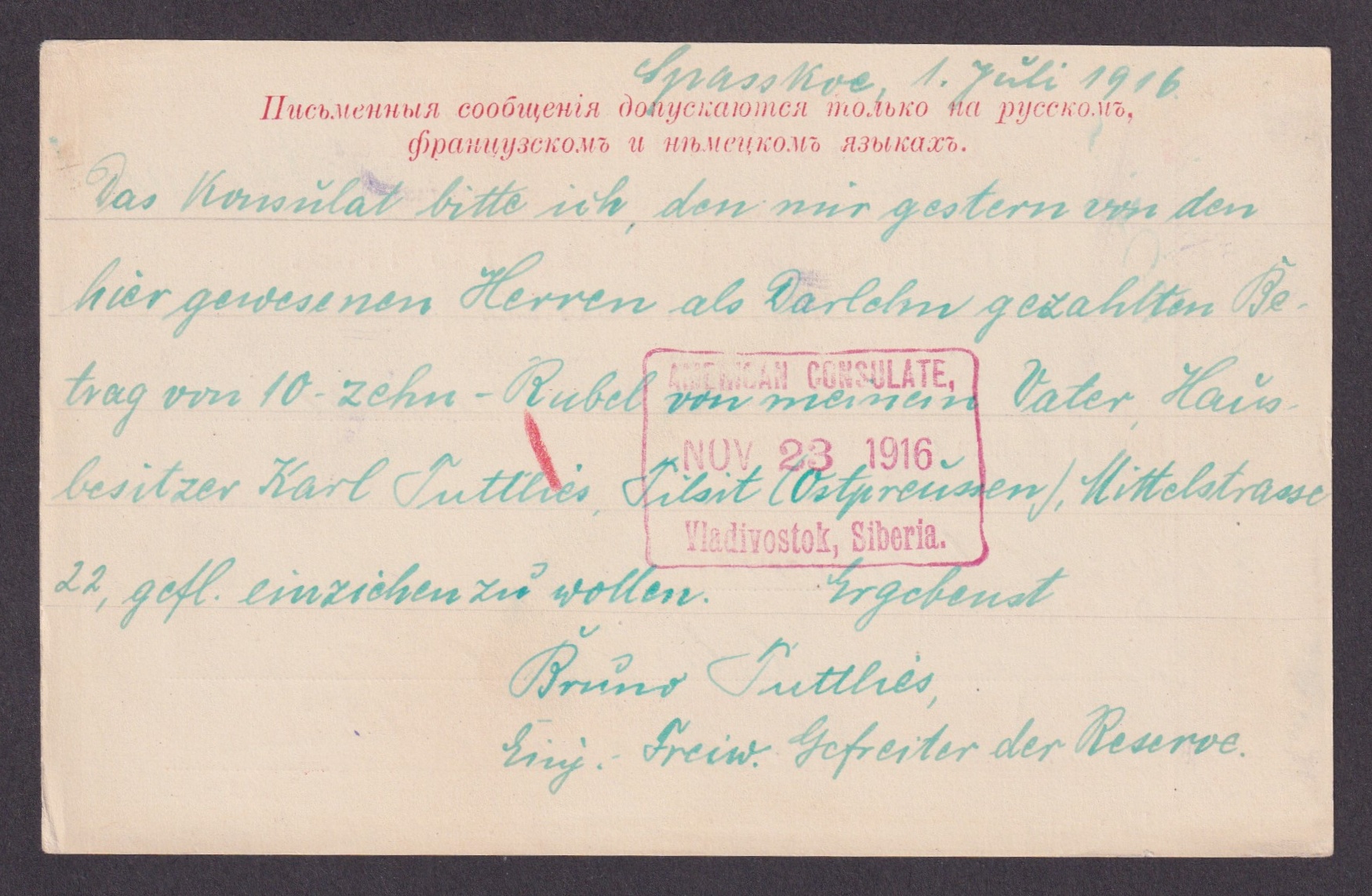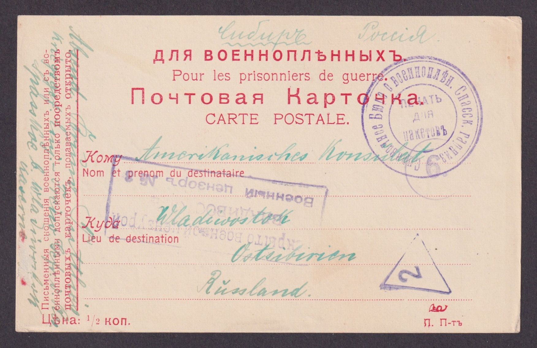Почтовая карточка военнопленного. Просмотрена цензором и справочным бюро. Военноплен. Спасского гарнизона. Адресована американскому консулу во Владивостоке.