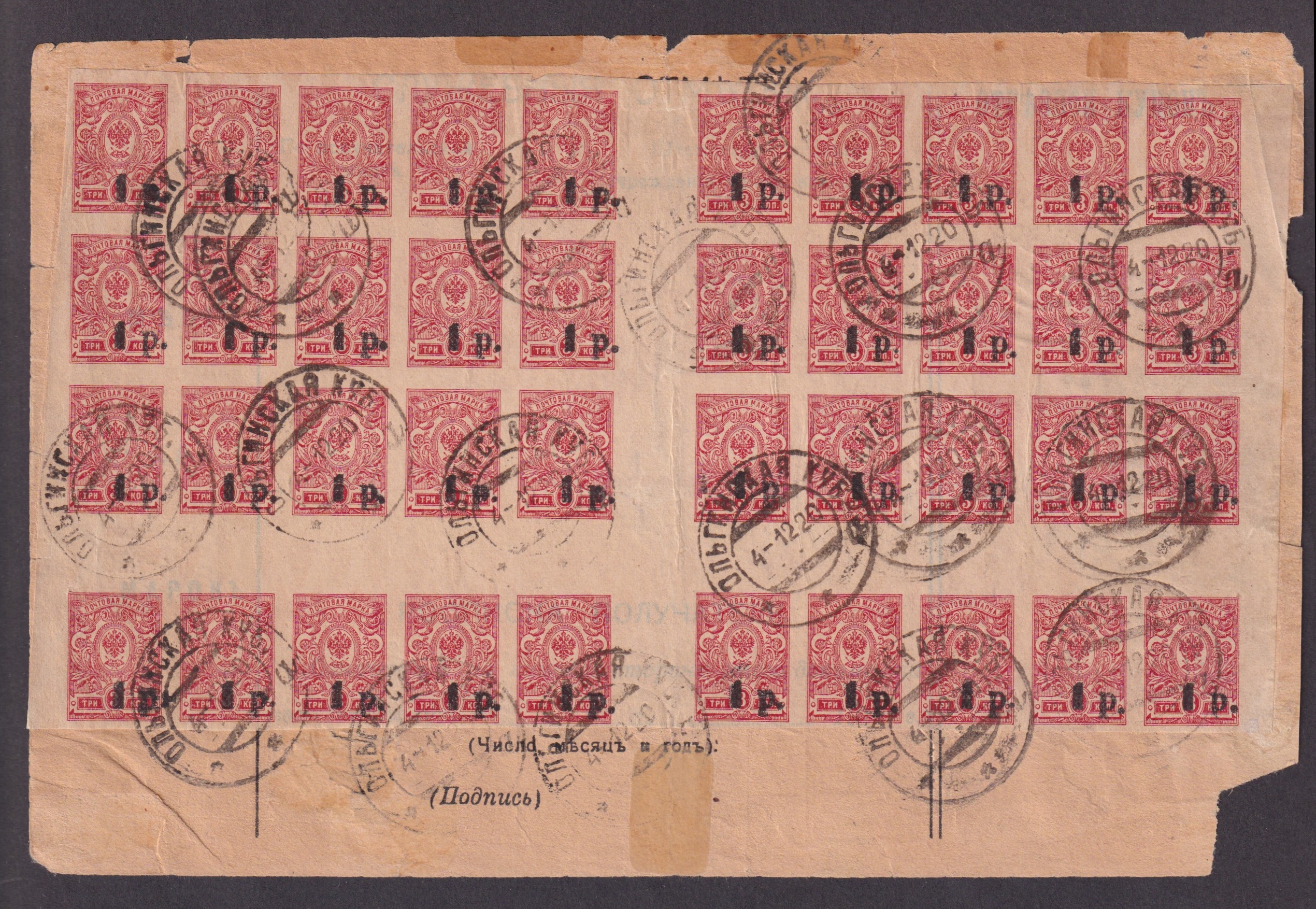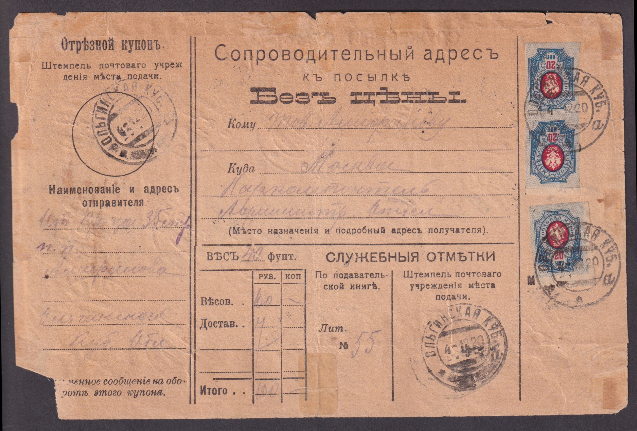 Гражданская война. Сопроводительный адрес к посылке, франкированный марками Кубани.