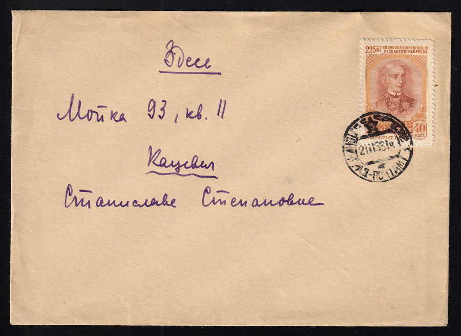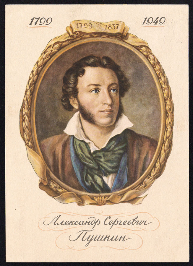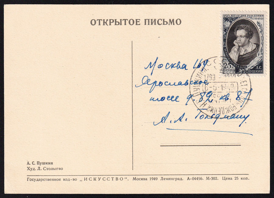Штемпель первого дня: "150 лет со дня рождения А.С.Пушкина".