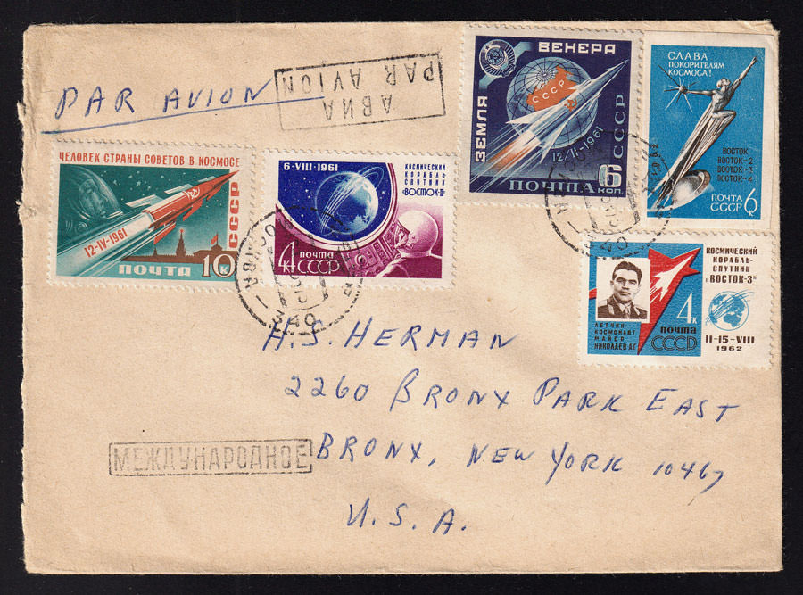 ХМК АВИА «Самолет ТУ-114 над рекой», прошедший почту. Почтовые штемпеля "Северный полюс-10" (2 штемпеля), Ленинград".
