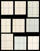 Кат. № 1549I. Второй выпуск (h 32 мм). Квартблок. Цвет: темно-синяя. Печать: глубокая. Растр КВ (квадрат). Перфорация линейная 12 1/4.