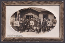 Открытка с изображением русских солдат и отметками о пересечении 3-х границ в виде марок этих стран.
