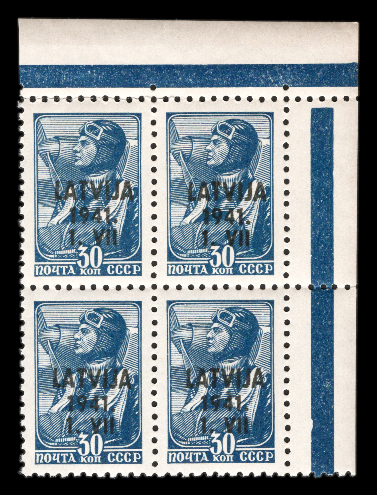 Имеется надрыв по перфорации слева сверху. Надпечатка чёрная "LATVIJA 1941. 1. VII" на марке №608. Печать: типографская. Перфорация гребенчатая 11 3/4 : 12 1/4.