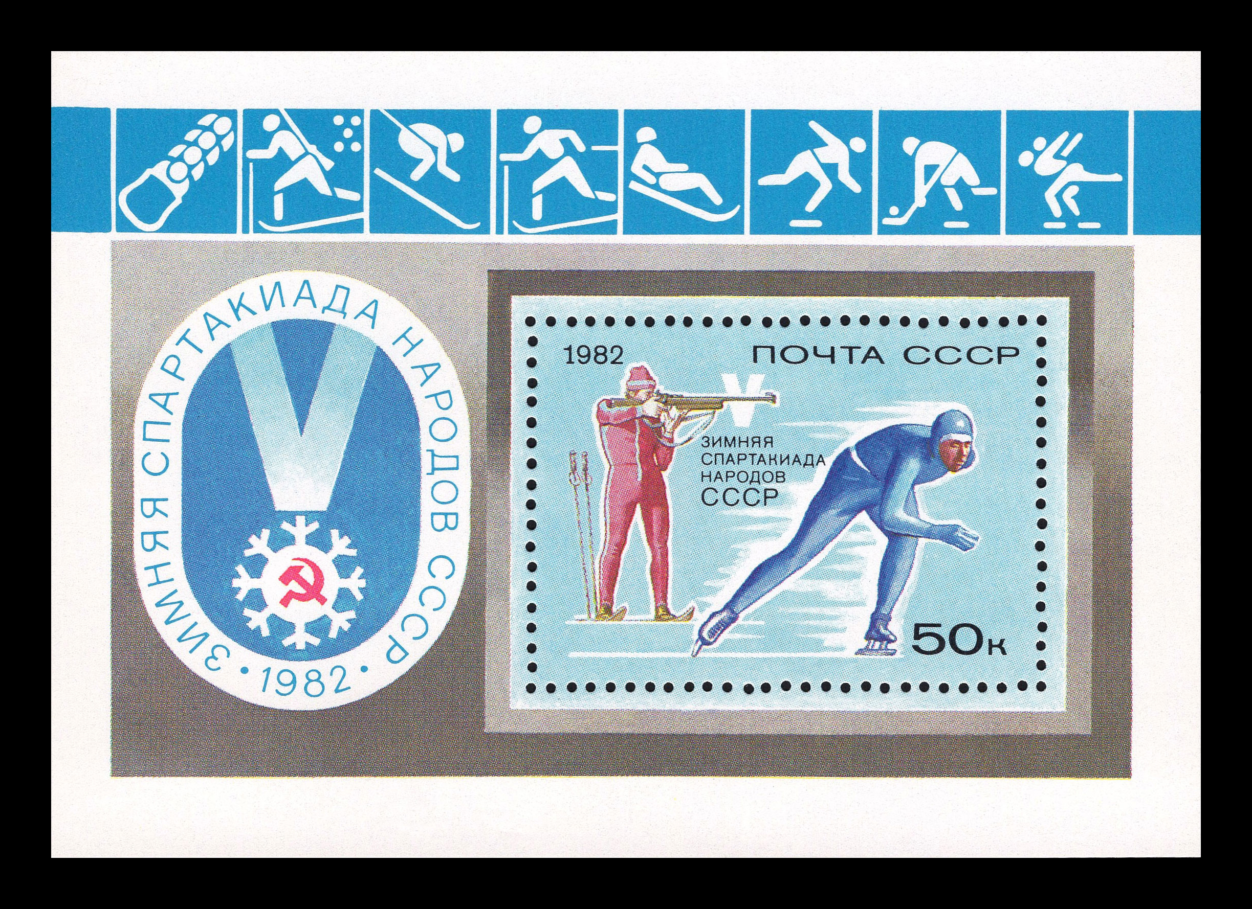 Кат. № Бл 113. Надпечатка офсетная красная текста "Слава советскому спорту! Спортсмены СССР завоевали 13 золотых, 6 серебряных, 8 бронзовых медалей" на Бл 112.