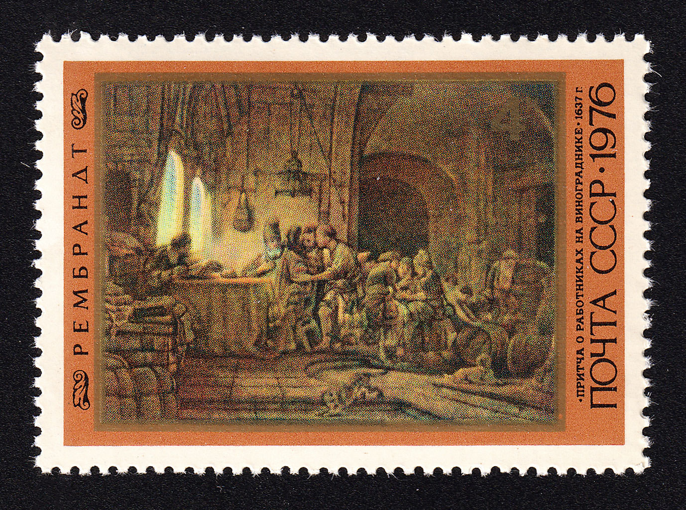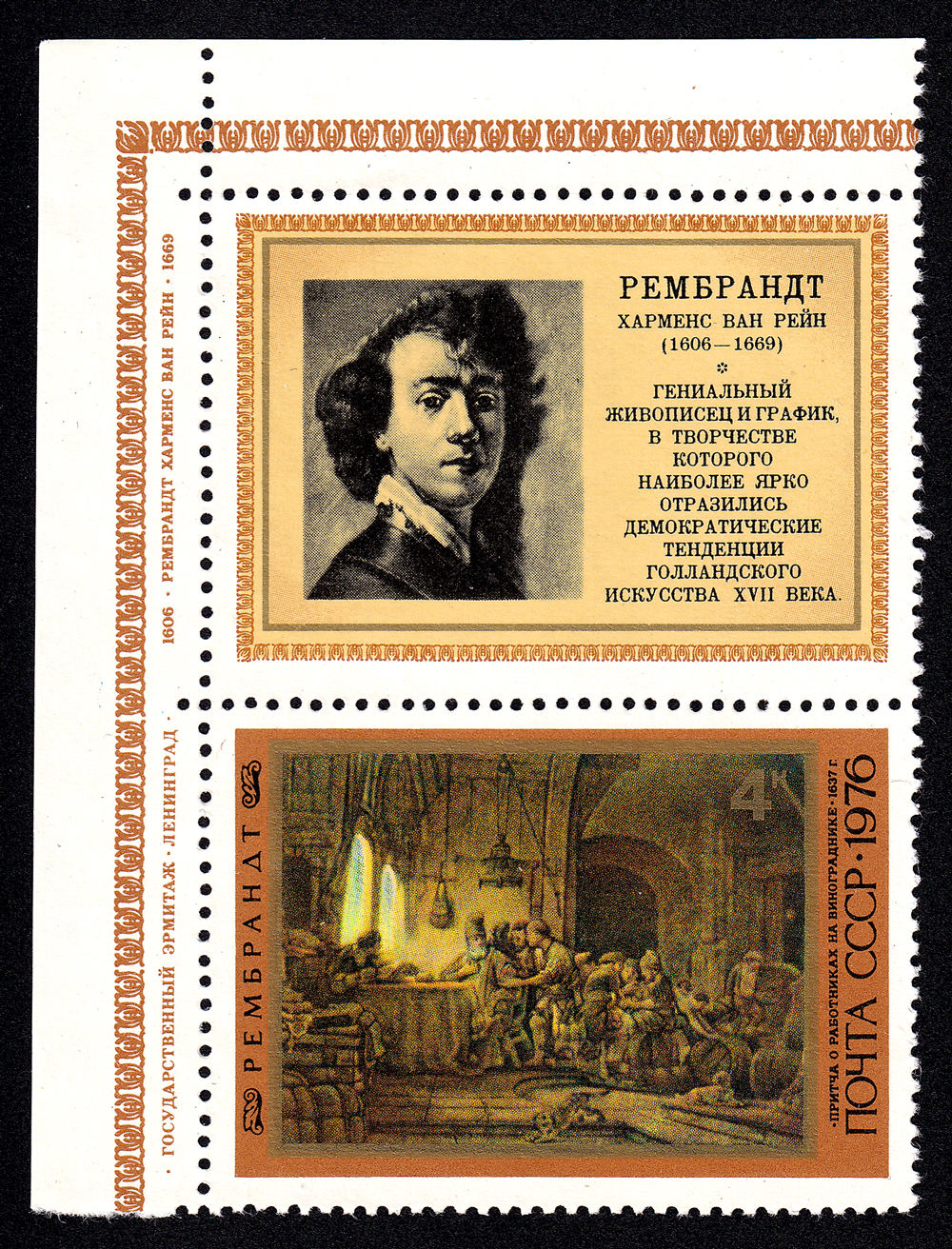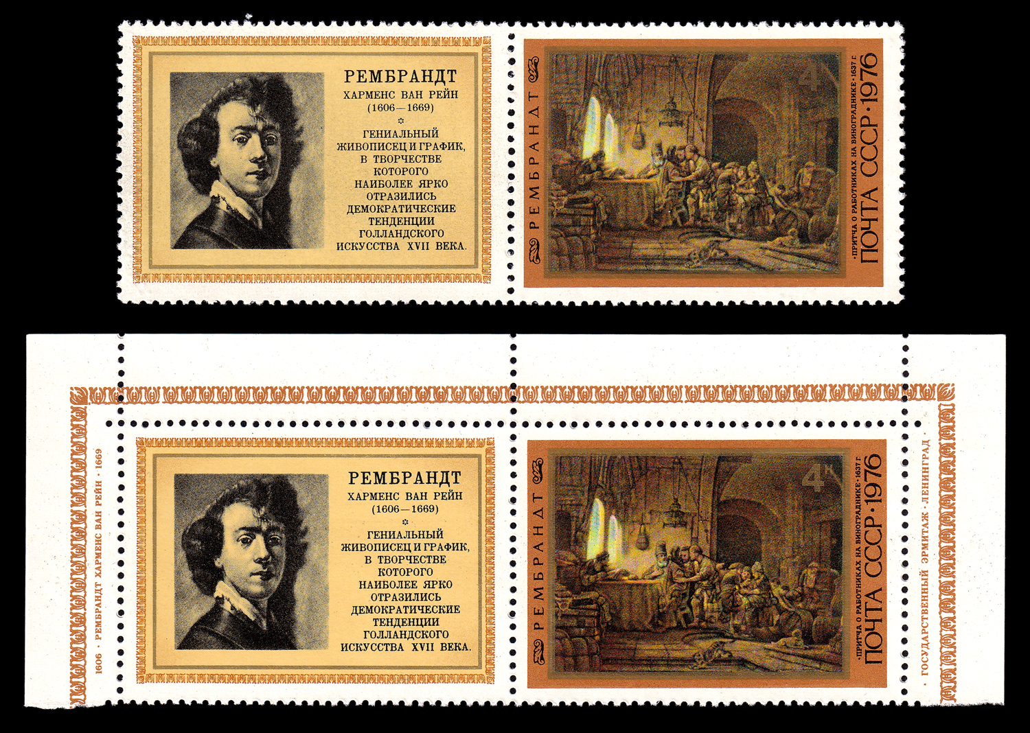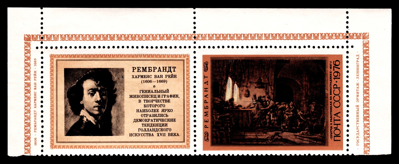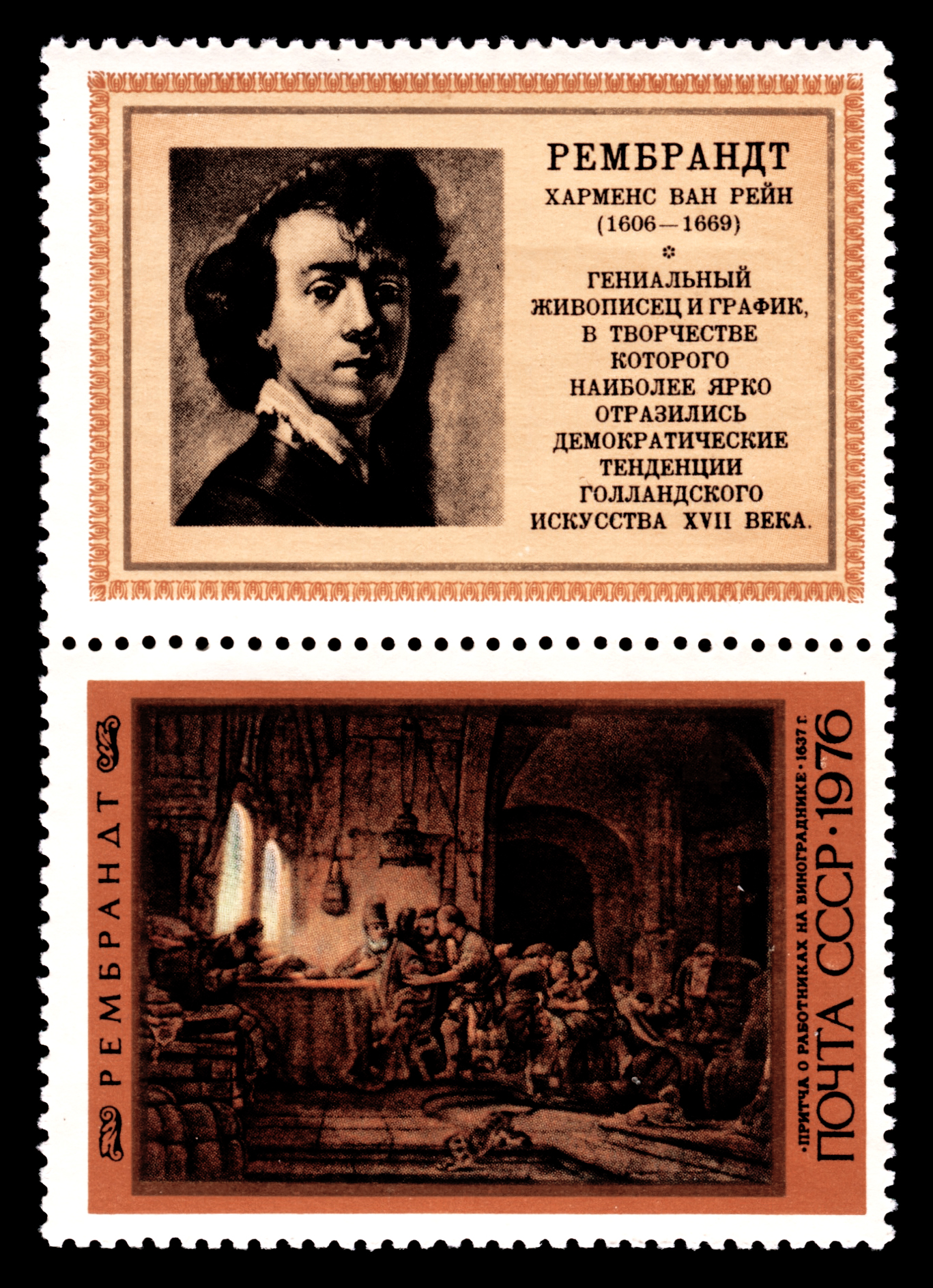 Набор 2 марки:1) "Притча о работниках на винограднике" 4 к. Кат. № 4601. Тираж – 6800 000. 2) "Портрет брата Рембрандта Адриана" 20 к. Кат. № 4605. Тираж – 4800 000. Печать: офсет с лакированием. Перфорация гребенчатая 12 : 12 1/2.