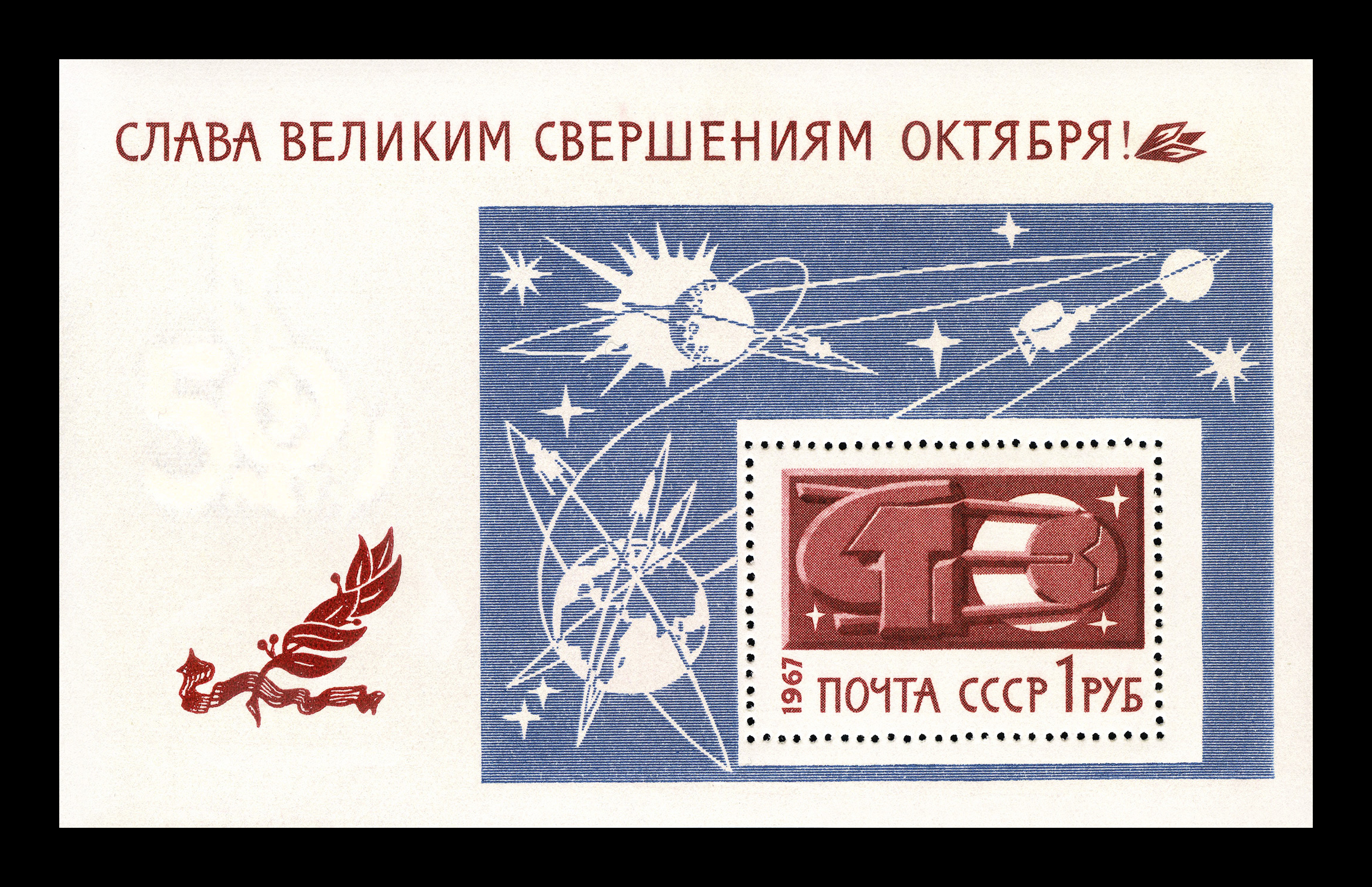 Кат. № Бл 52. Размер 130 х 80 мм. Тираж – 700 000. Печать: металлография и типогр. Wm – "50 лет". Перфорация рамочная 12 1/2 : 12.
