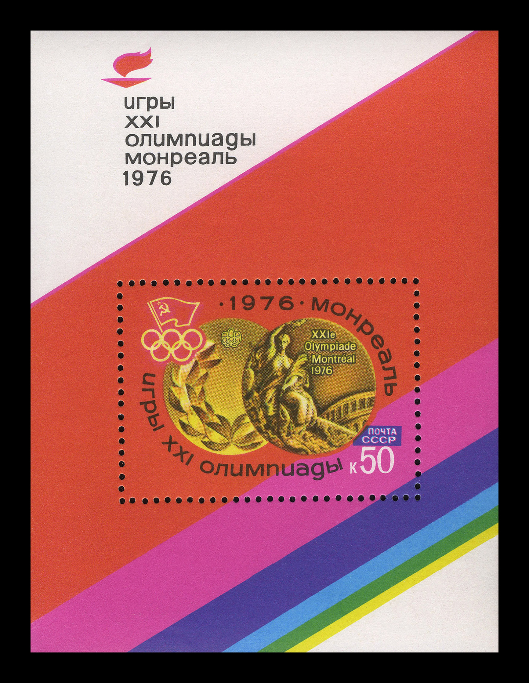 Кат. № Бл 118. Надпечатка офсетная золотая текста "Спортсмены СССР завоевали 47 золотых, 43 серебряных и 35 бронзовых медалей!" на Бл 116.